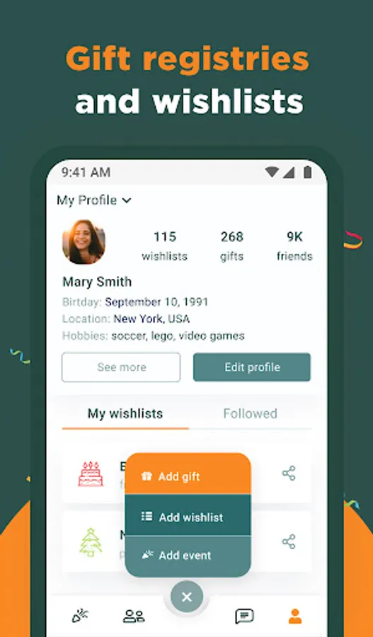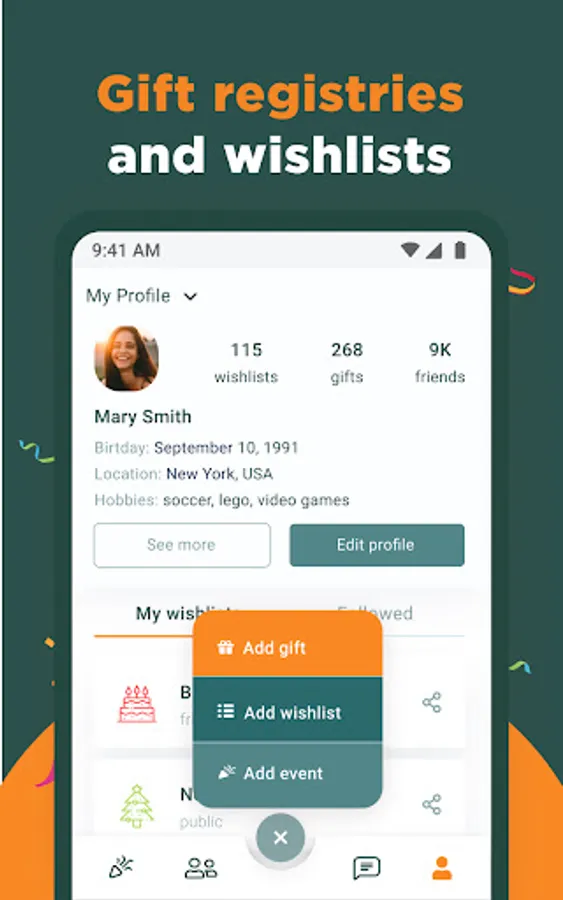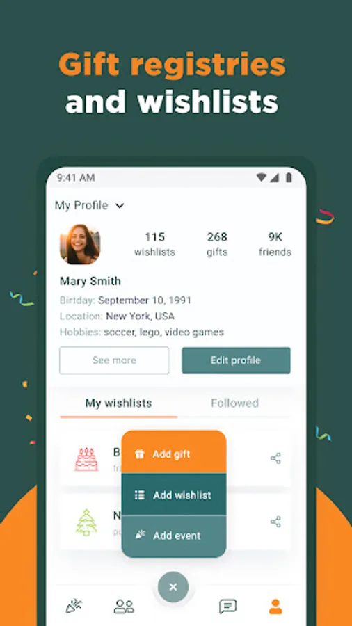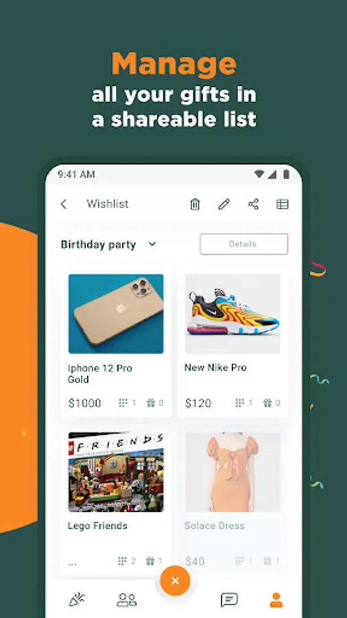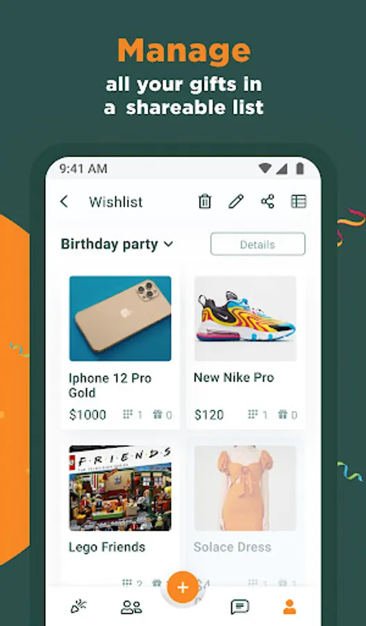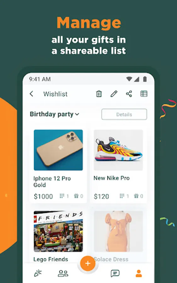 Create a profile, make a list of the gifts you want to receive, and add new items at any time. Don’t forget to add a link to the exact item desired, indicating the quantity, size, color, and other relevant details.