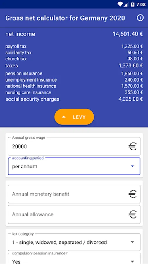 The gross net calculator uses your information to calculate your personal net salary in Germany (annually, monthly, weekly or daily) for the year 2020. Wage tax, solidarity surcharge, church tax if applicable and the social security contributions (pension insurance, health insurance, nursing insurance and unemployment insurance) are taken into account.