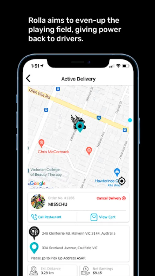 The Rolla Driver App links directly to restaurants & cafes on the Delivery Angel marketplace.