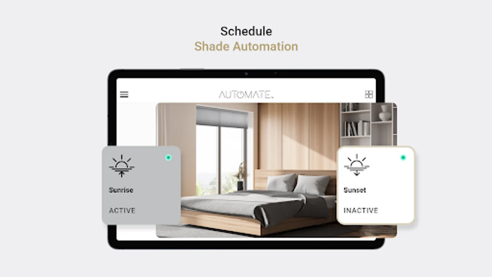 Utilizing your home’s time zone and location, the Pulse 2 can automatically raise or lower your Automate shades according to the position of the sun. Set a ‘Morning’ scene and watch all your shades promptly rise when you start your day, or create an “Evening” scene that will dynamically alter based on the sunset in your location.