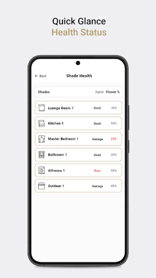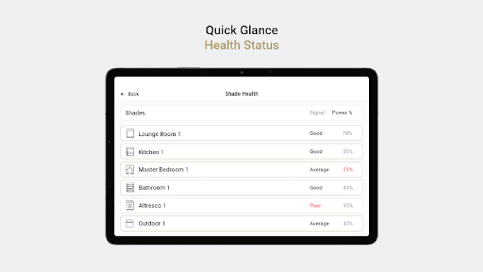Quickly view the Health Status of all your shades. A summary screen displays the battery levels of all your shades along with signal strength indicators, prompting necessary action to either charge your motors or troubleshoot connections.