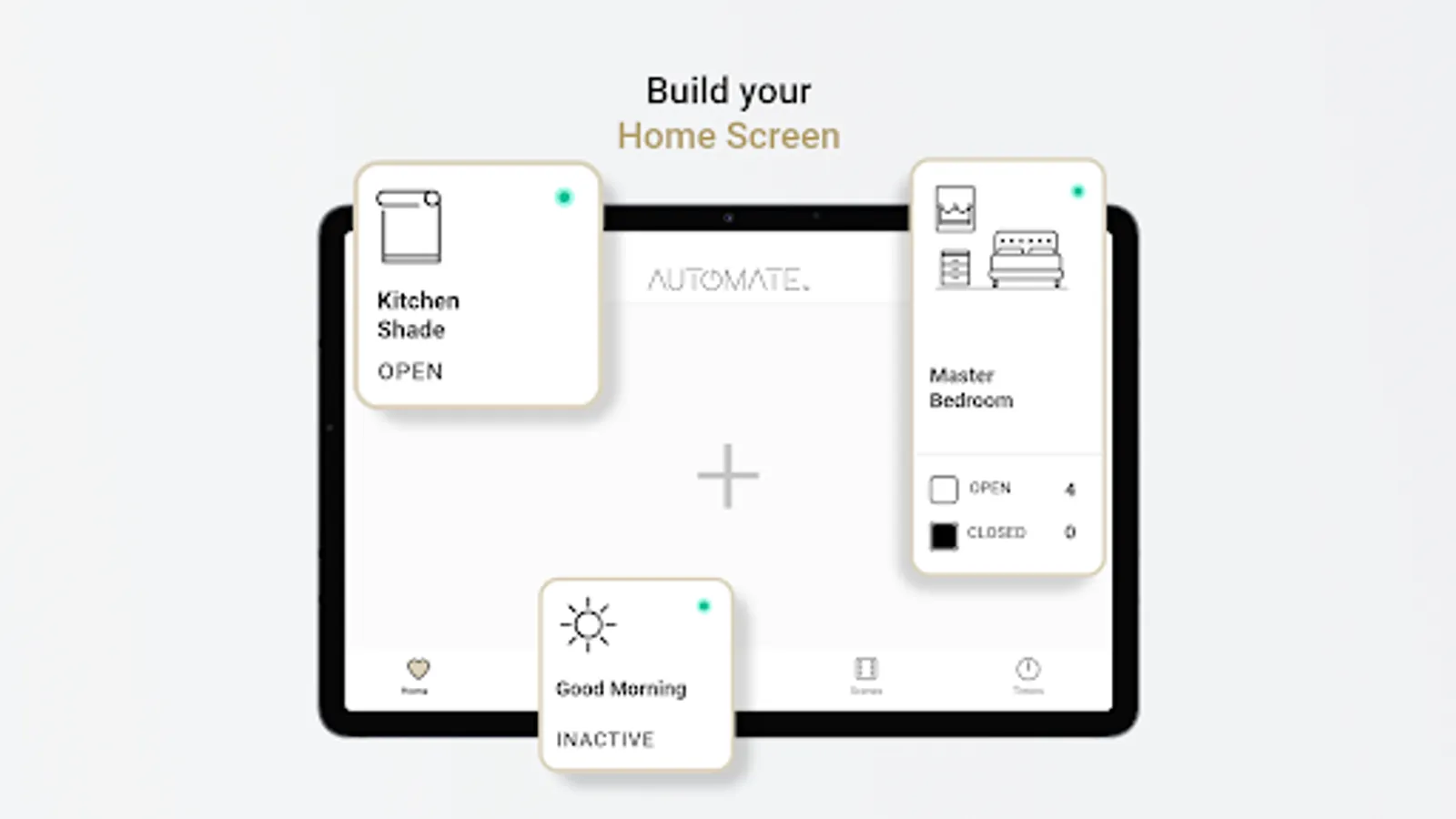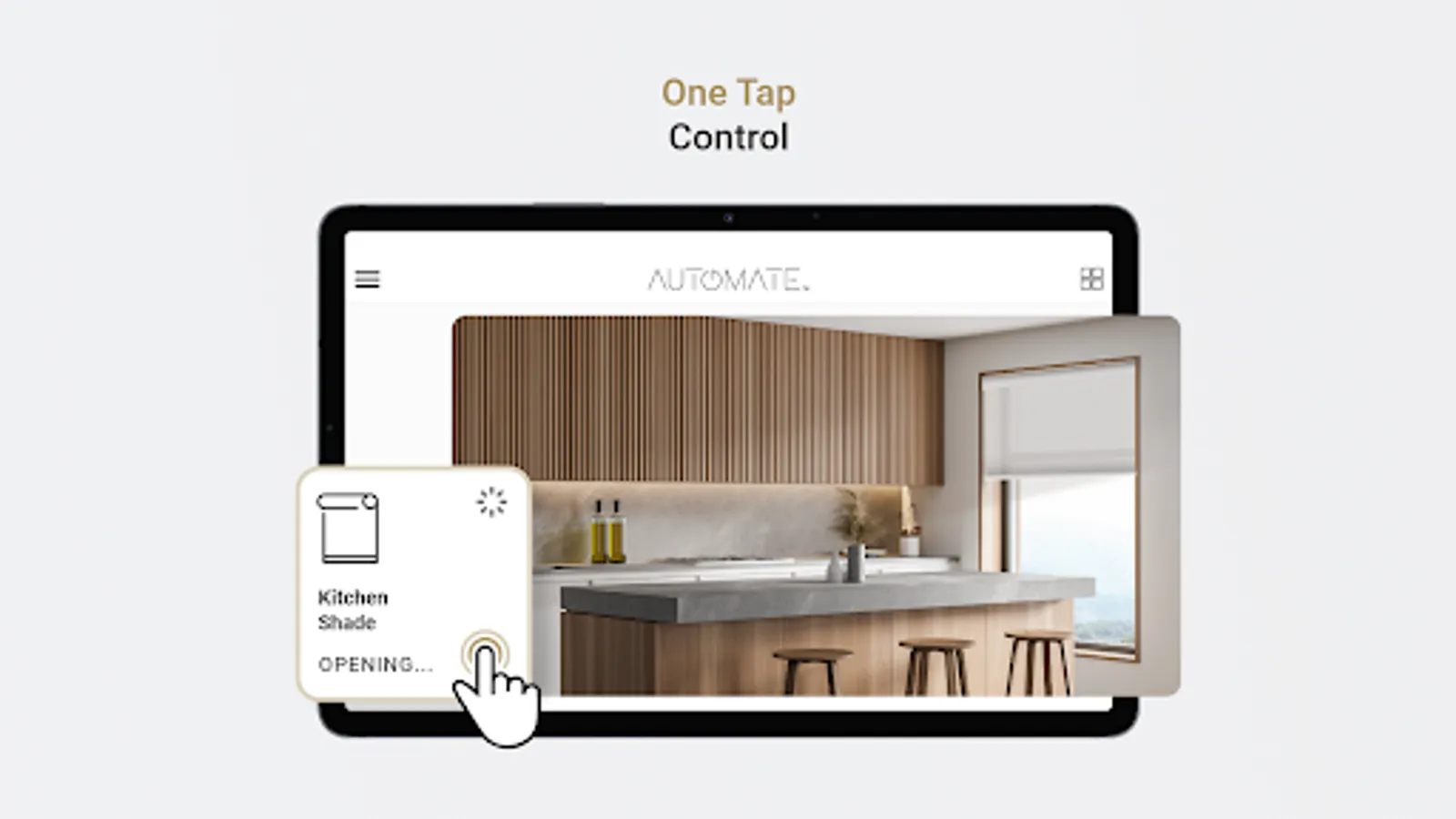 The new Automate Pulse 2 App not only allows you to activate, adjust and automatically position your shades but does so through One Tap on the Shade Tiles. One Tap to close, One Tap to open and One Tap to activate and stop scenes. A double tap stops a shade’s operation, and a single long press opens a dedicated shade control screen giving you access to more customized settings. White tiles indicate the shade is open or partially open and a grey tile indicates the shade is closed.