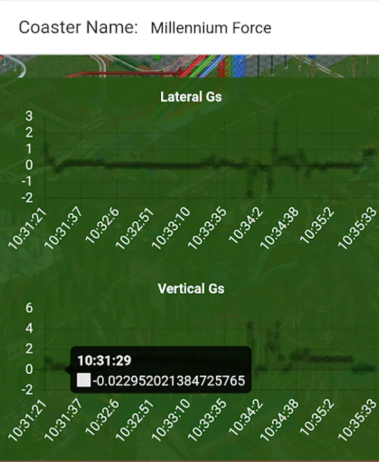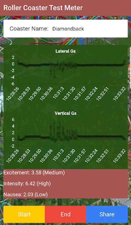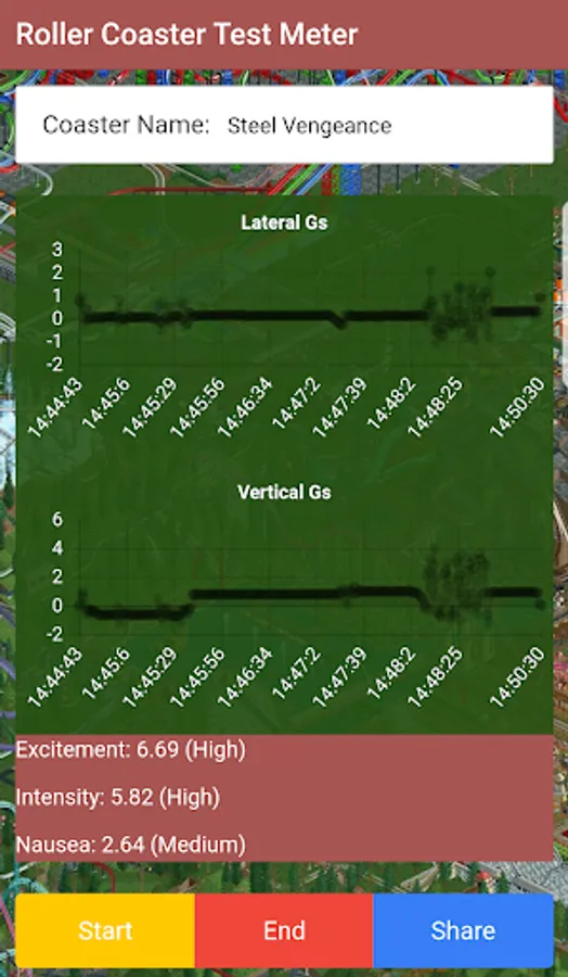 By taking the formulas for excitement, intensity, and nausea from the original game and using your accelerometer you can now get ratings of real coasters using the accelerometer on your phone! Simply turn the app on, hit start, and insert your phone into a safe pocket with the screen facing left. After you get off the coaster, hit end and see the rating! Share the rating onto social media. This is a fun toy for roller coaster enthusiasts and amusement park goers everywhere!