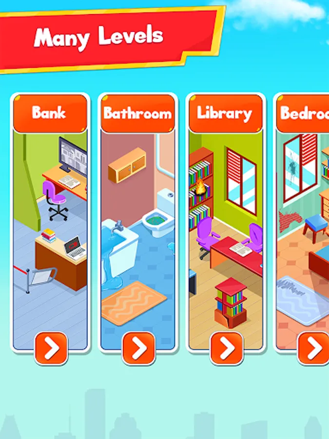 From fixing the kitchen sink, repairing the broken statue at museum to getting things organized in bank, there are a lot of levels and exciting places to fix. Select your favourite scenes for the fixing, cleaning, repairing and renovating activities: