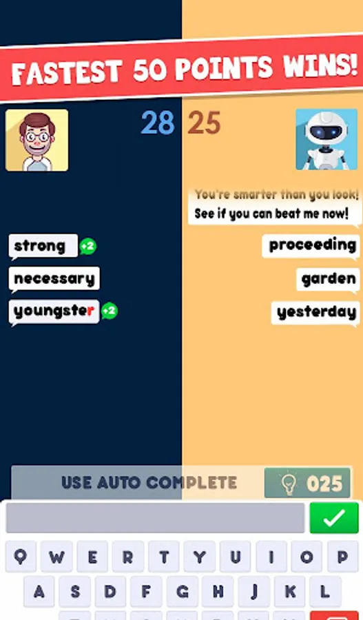An amazing and addictive word game more like a word war. Try to type bigger words to earn more points than your opponent. The more words you know and type faster, more the chance of winning. Explore a lots of surprising challenges in this vocabulary rich word game.