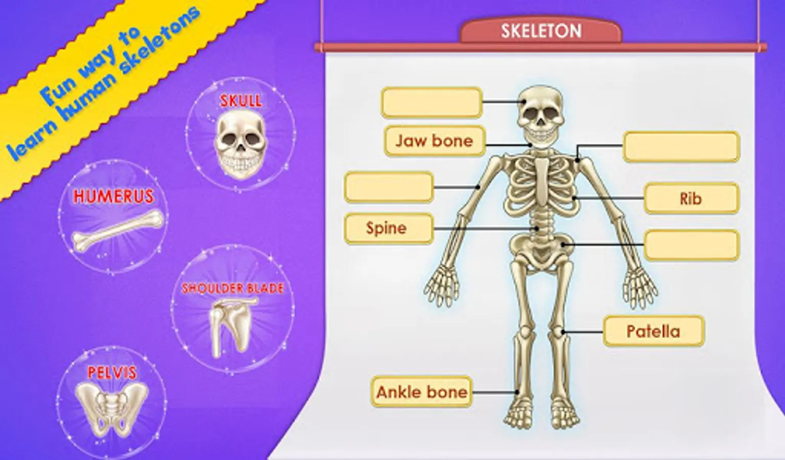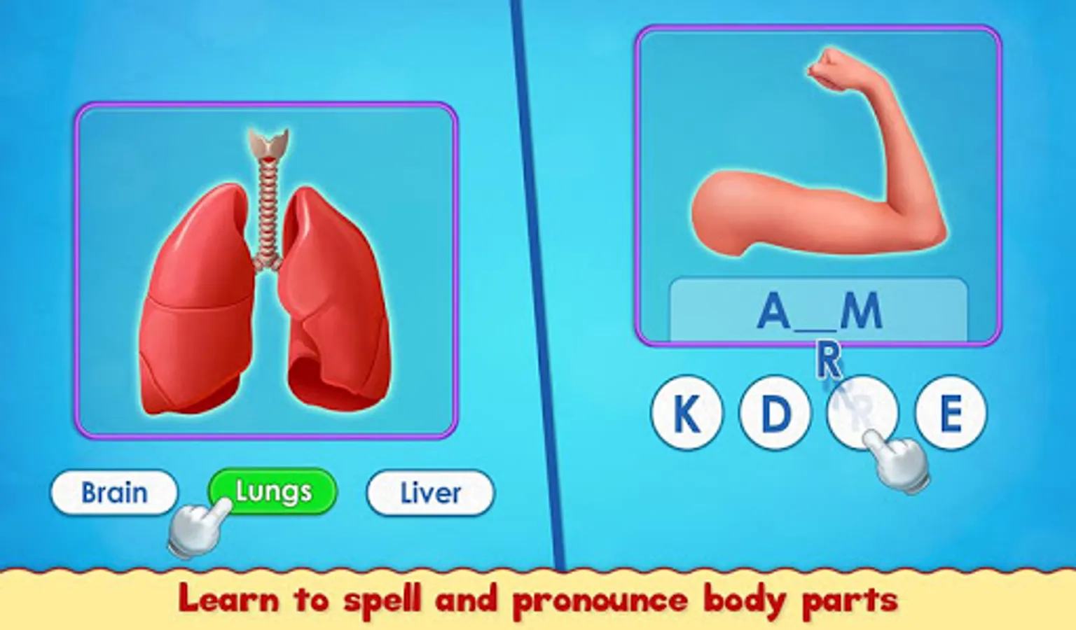 This educational app helps child recognize different body parts (like eyes, ears, nose, hands, legs, stomach, etc.), and learn about it. Not only outer body parts we have a lot of internal organs and skeletons as well to learn. A unique and interactive way for your kids to learn and recognize Human Body Parts basics.