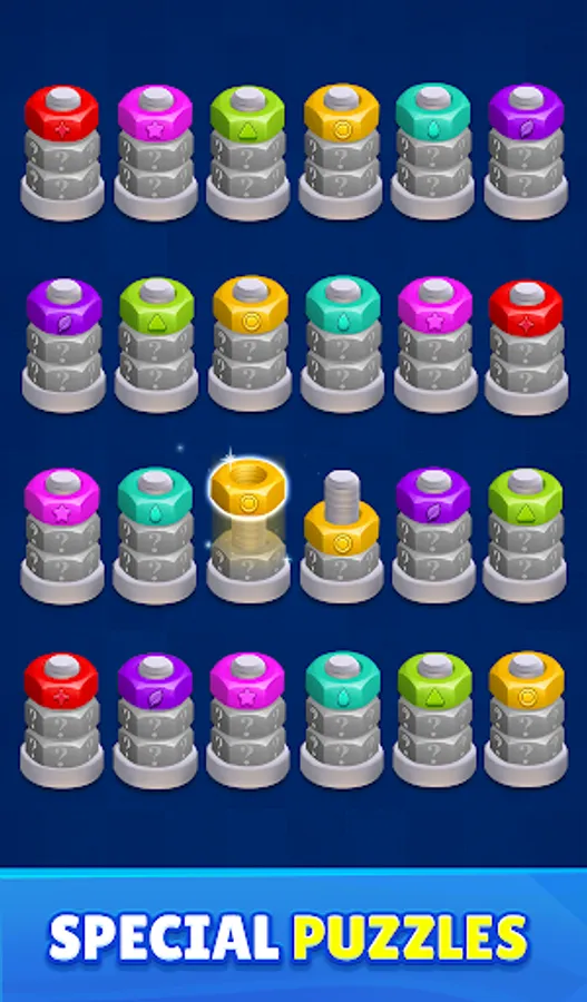 Your mission? Strategically stack each nut onto its matching bolt, one by one. But don't get ahead of yourself! Plan your moves carefully to avoid getting stuck. The more you progress, the trickier the screw sorting puzzles become, making this nut game a true brainpower booster.