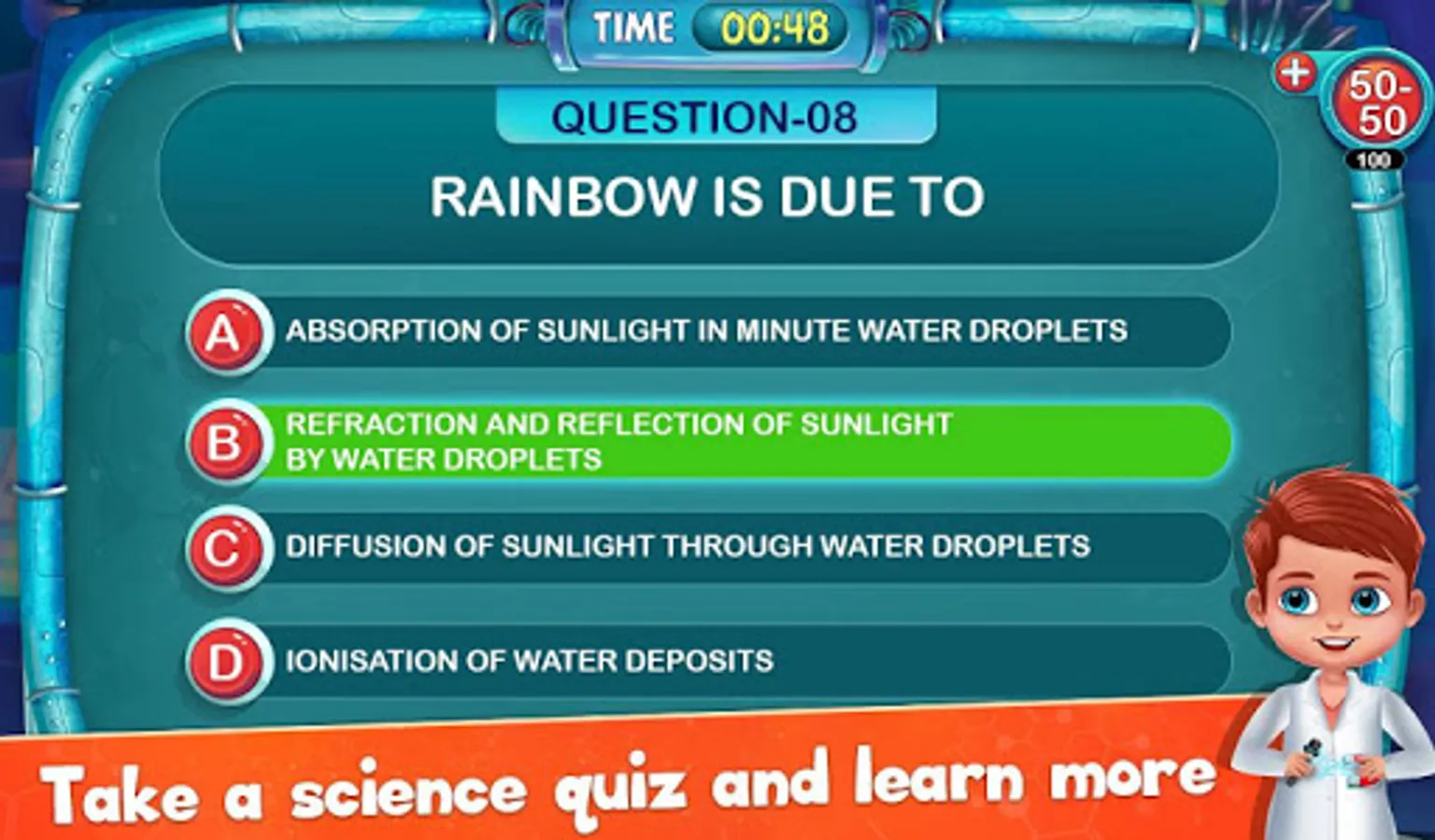 Discover the amazing world of fascinating scientific facts! This general science quiz game mode is not just quiz, but you can also learn from it. Try out the updated science experiments game and play its whole new level of exploring various science facts.
