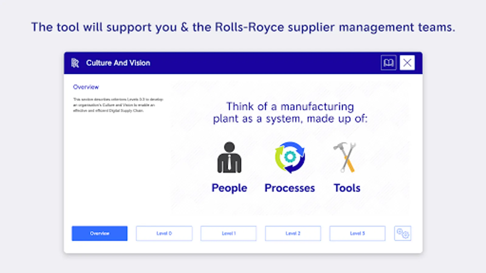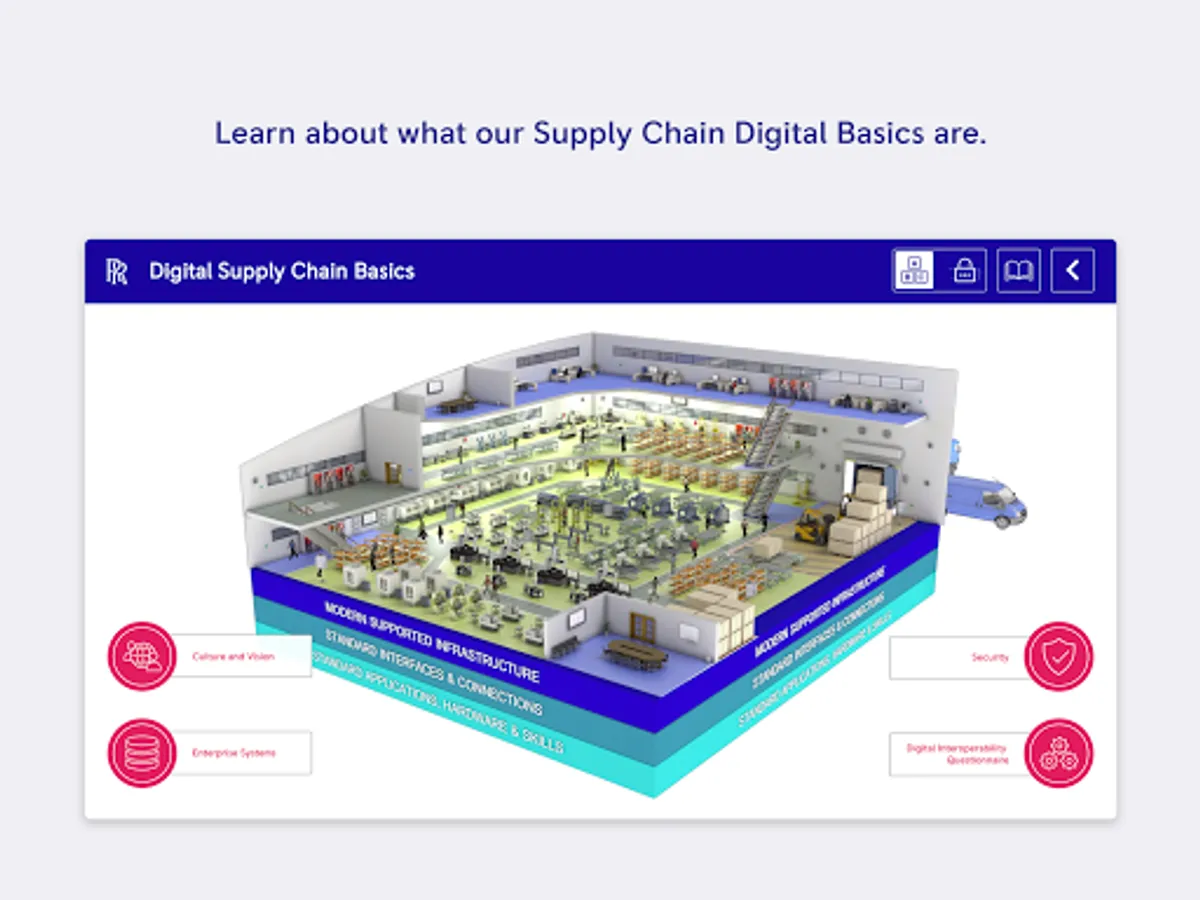 The Rolls-Royce Digital Supply Chain app provides you with an interactive tool with access to information & guidance material concerning why we need to enable a digital supply chain, what we mean by a digital supply chain & how we can work together to enable this capability.
