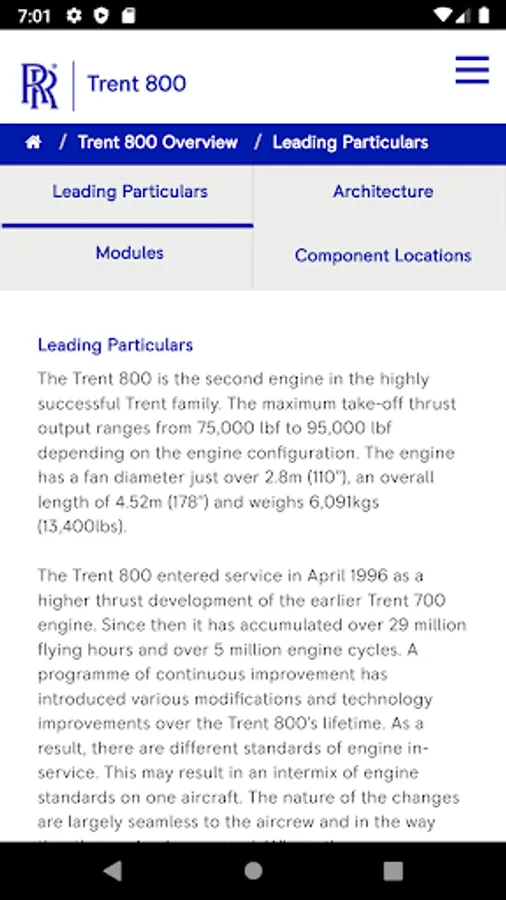 The Rolls-Royce Trent 800 Pilot Guide app is an interactive reference tool for the classic engine choice for the Boeing 777. The app brings together educational material and real engine characteristic data to allow an airline pilot to understand the engine that delivers the power for the Boeing 777 aircraft. This is complemented with the latest Rolls-Royce operational recommendations for the best use of the Trent 800, and the latest understanding on environmental factors that may need to be considered when flying with the engine.
