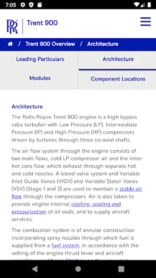 The app provides an opportunity to learn about the key modules and components of the Trent 900 through the interactive ‘Engine Overview’ feature and understand how they work together to deliver a range of ‘Engine Systems’.