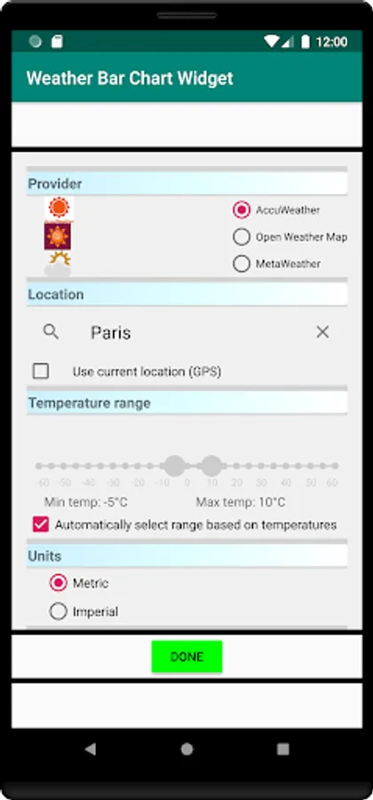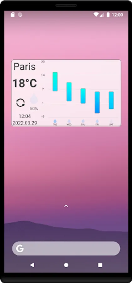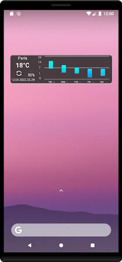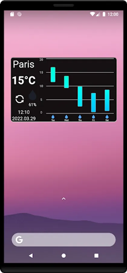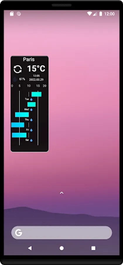 This simple widget shows the maximum and minimum temperatures for a chosen location. It also shows the current temperature and humidity. You can choose from several weather providers and customize the color of the background and the text. The scale for the maximum and minimum temperatures can be manually set or automatically controlled. The widget can show temperatures in Celsius or Fahrenheit and will update at regular intervals. The color of the bars indicates the relative temperature (red for very hot, blue and white for very cold) or can be changed to indicate the relative humidity for each day. The bars can be oriented vertically or horizontally to be better aligned with your point of view.