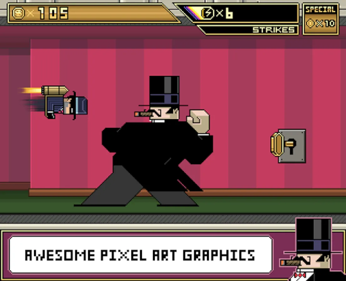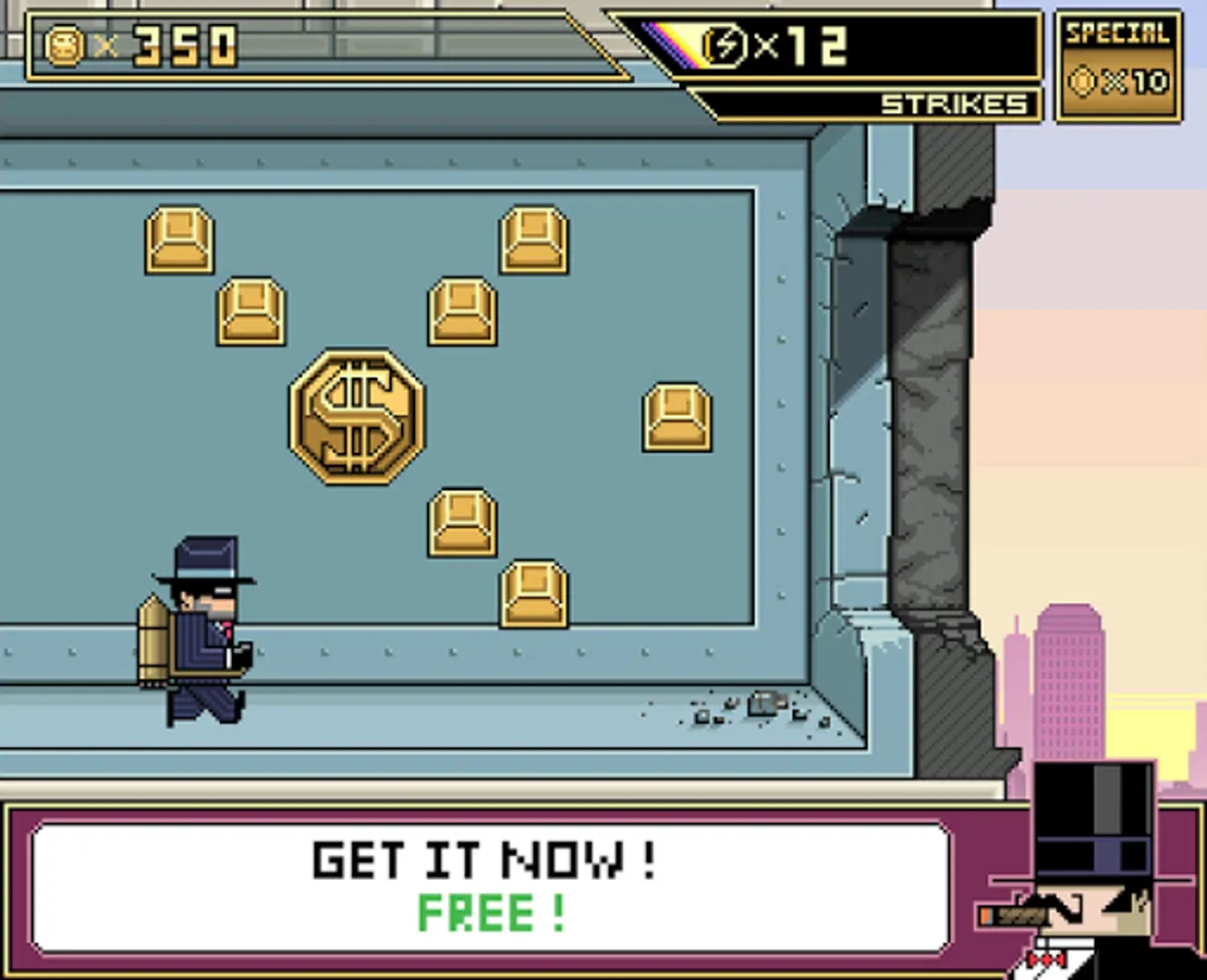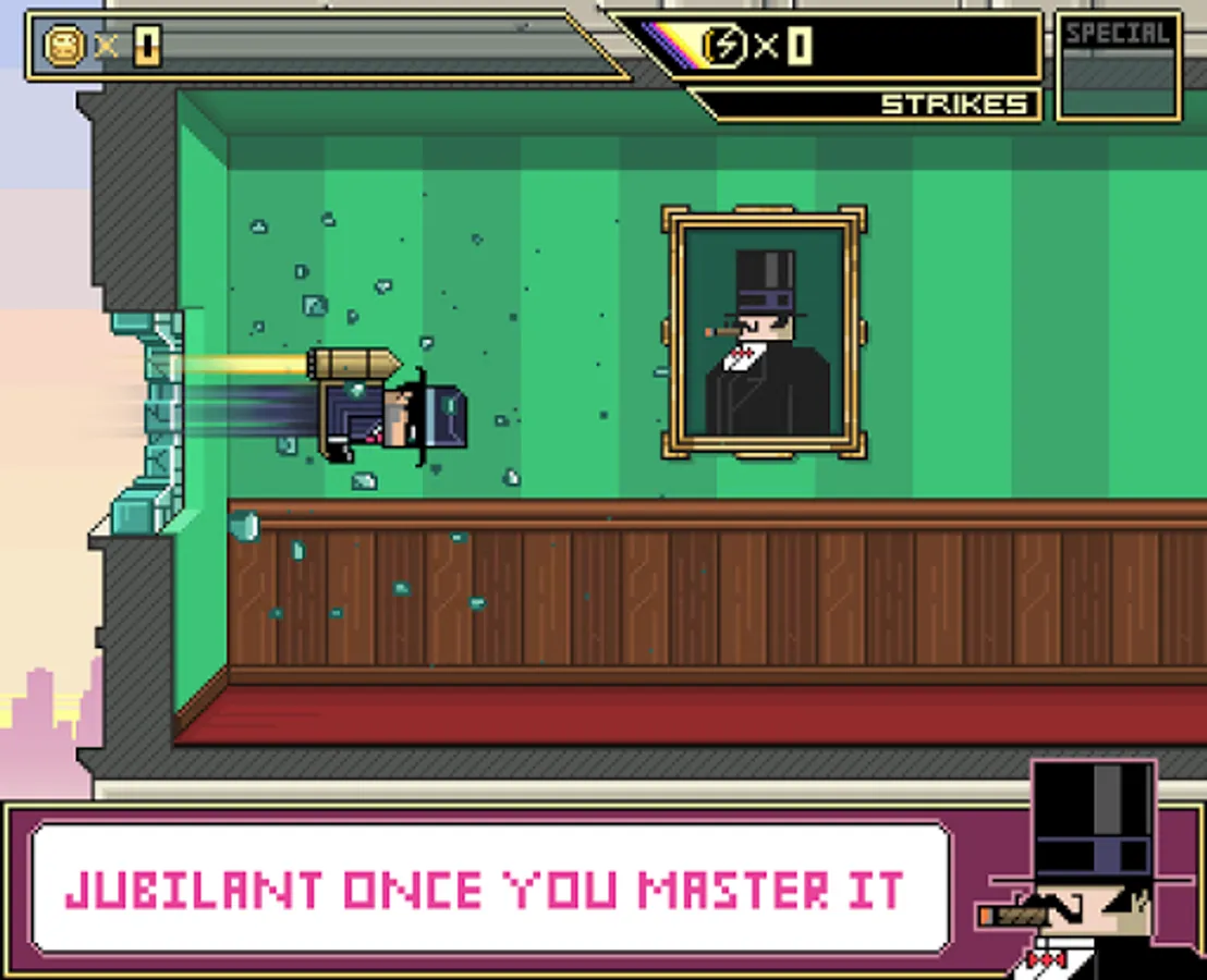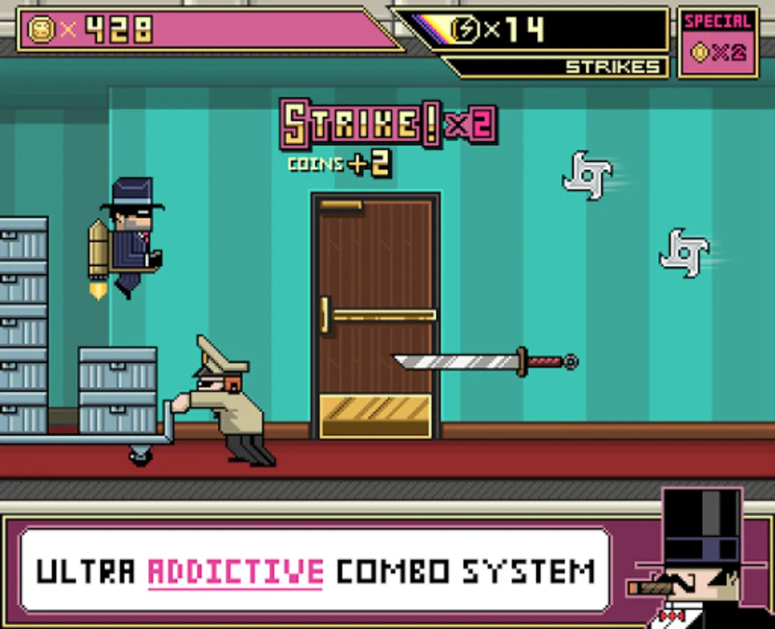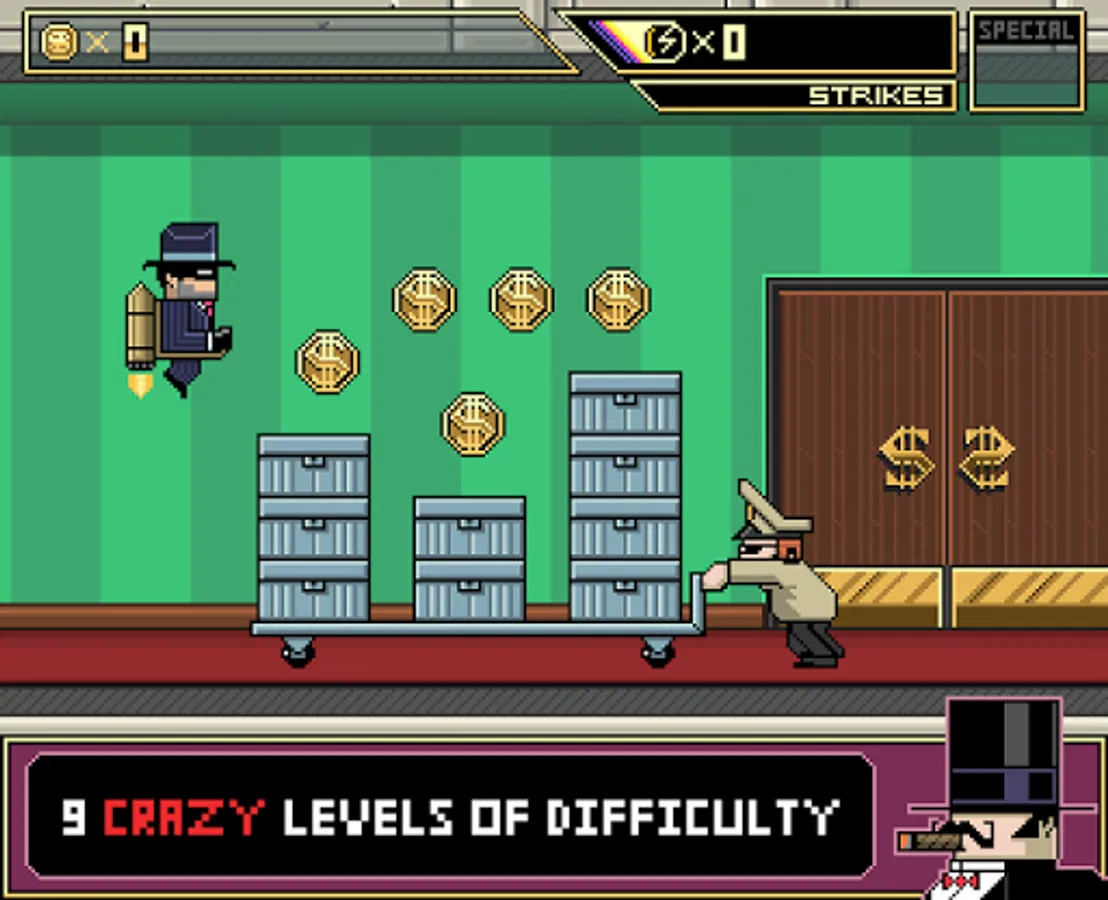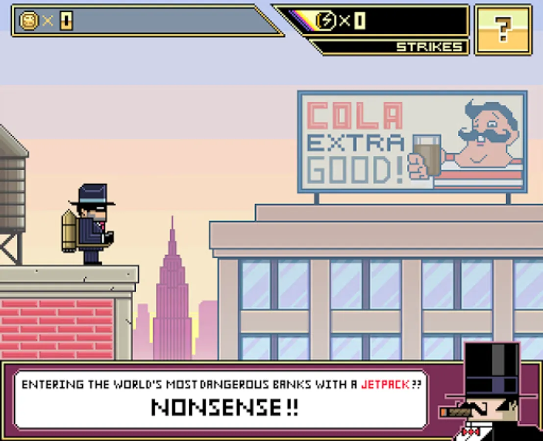In this challenging pixel art adventure, you play as Billy, a jetpack avenger trying to infiltrate retro bank skyscrapers to retrieve money stolen by a secret organisation. The setting for the story is an awesome retro business district with high towers touching the sky, cyborg bankers and shaolin guards using dragon kicks and shurikens.