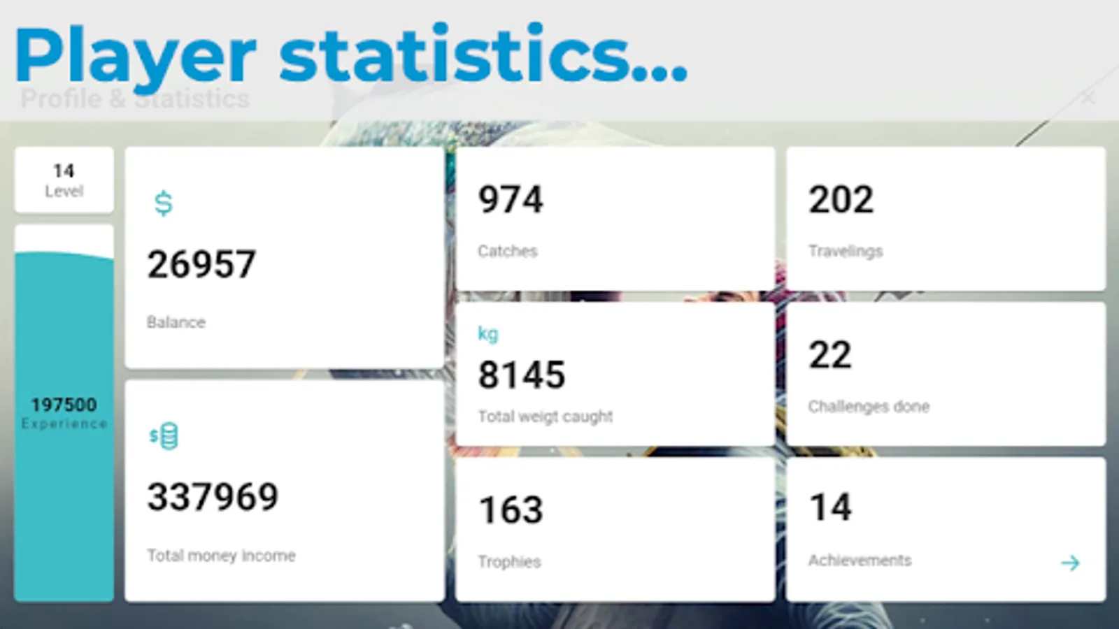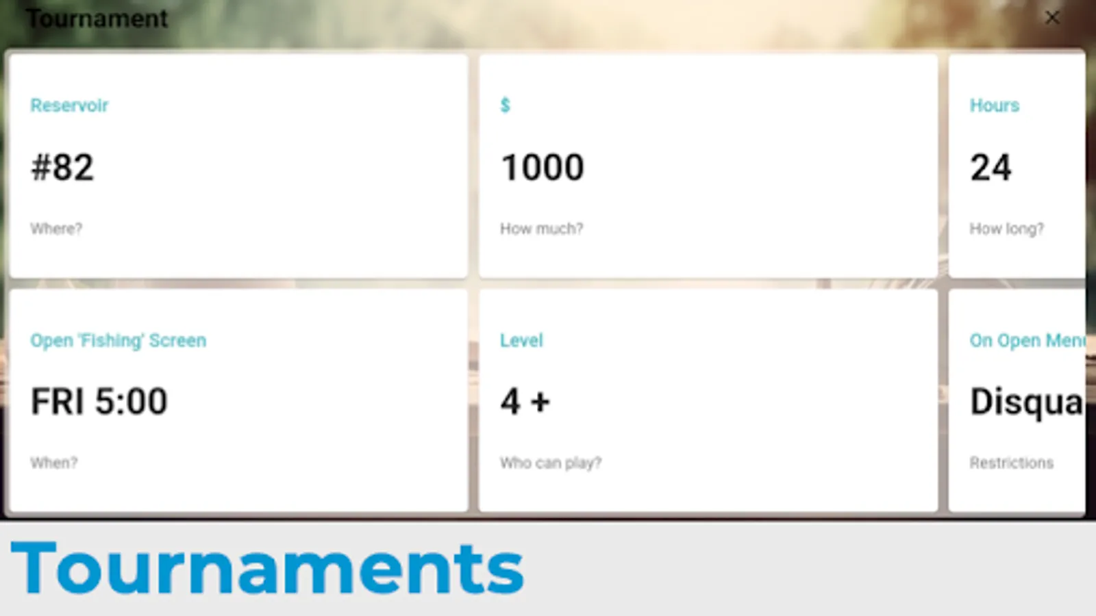 Catch amount of any fish. Catch amount of any trophies. Play challenge with random fish specie for amount or trophies count.