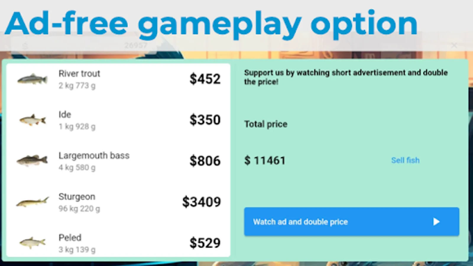 Game uses low MB to show ads. Offline single-player fishing simulator.