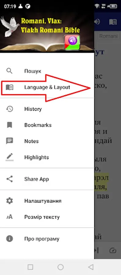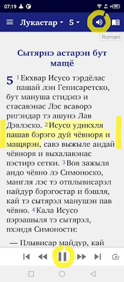 • The Gospel of Luke has audio files integrated into the app. Just click onto the little loudspeaker on the top right side and onto the «Play» button to hear the text read out for you.