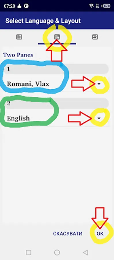 - "two panes" to display the Romani at the top and the English version at the bottom