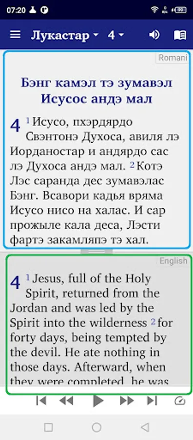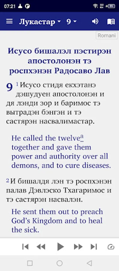 - "verse by verse" to display a verse in Romani followed by the same verse in English.