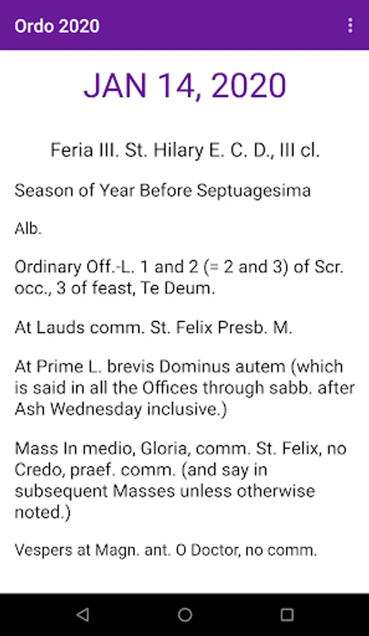The 2020 Ordo app gives immediate access to the Ordo listing of every day of the liturgical year. [NB: an ordo explains how to set one's missal and breviary, but does not offer readings or prayers, except some special blessings, such as of throats on the St. Blaise Day].
