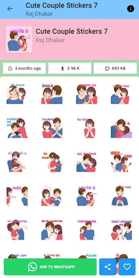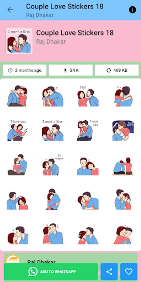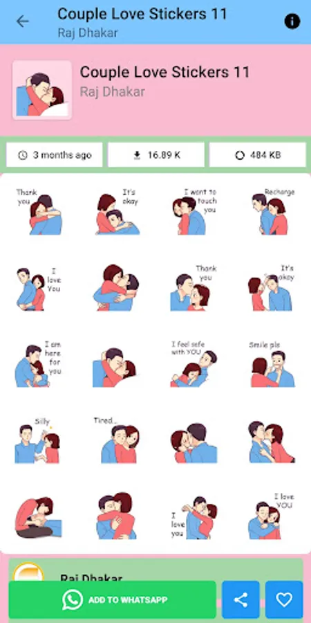 Stay connected with your significant other with our collection of cute and romantic couple stickers. From love hearts and kissing lips to hugging teddy bears, our app has everything you need to express your love and affection through chat. Simply download the app, choose your favorite stickers, and start sending them to your partner. With new packs added regularly, you'll always have fresh and fun ways to say "I love you." Download now and bring some romance to your messaging!
