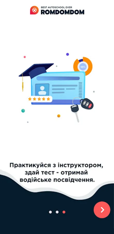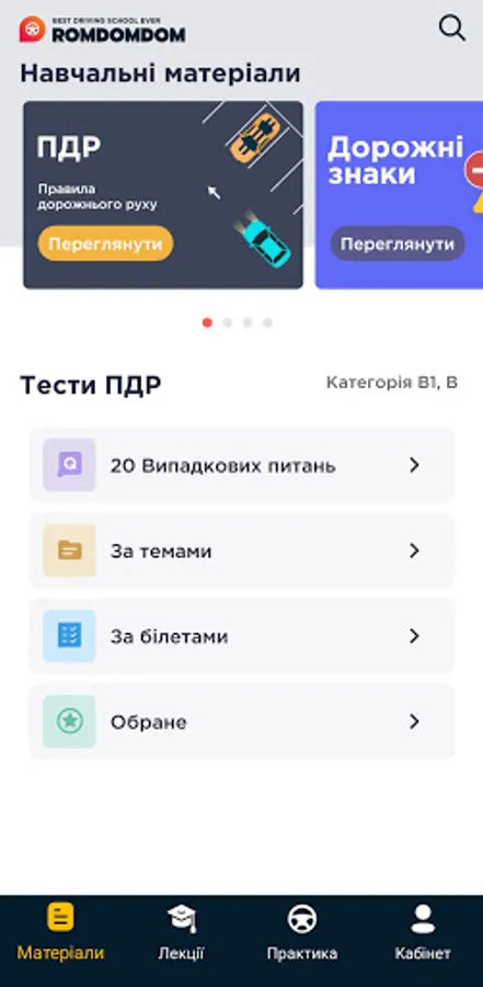 Learning with RomDomDom is easy and affordable. All you have to do is open the application, go through a short registration, choose the driving category you need and start the learning process. Our administrators will provide all the necessary information and you will be able to pass the theory of traffic rules and practical classes in the application RomDomDom.
