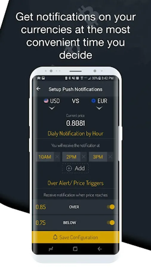 Have our app send you notifications on your favorite currencies changes or at any hour or price change you select. Want to know more about our app? π