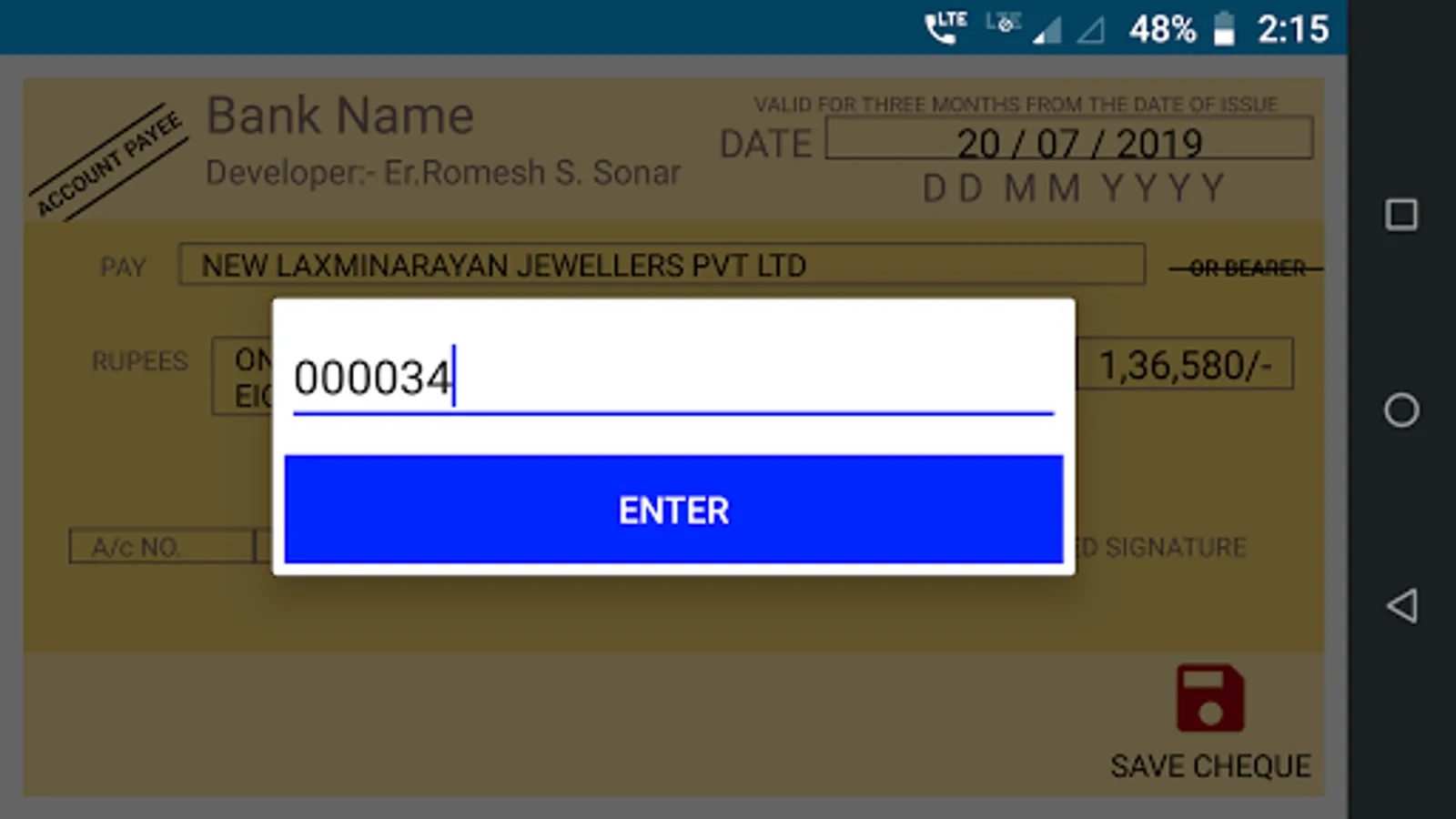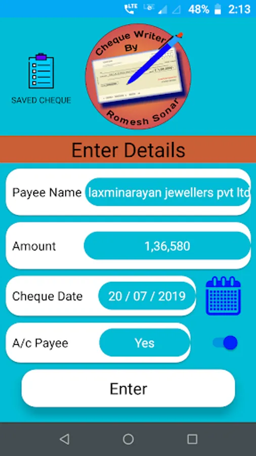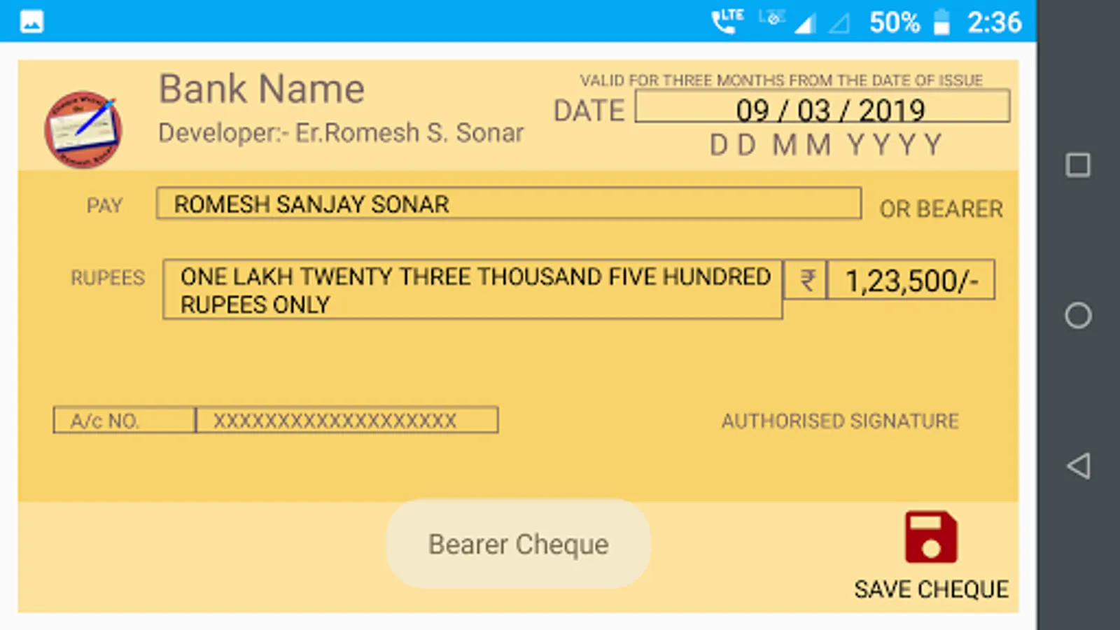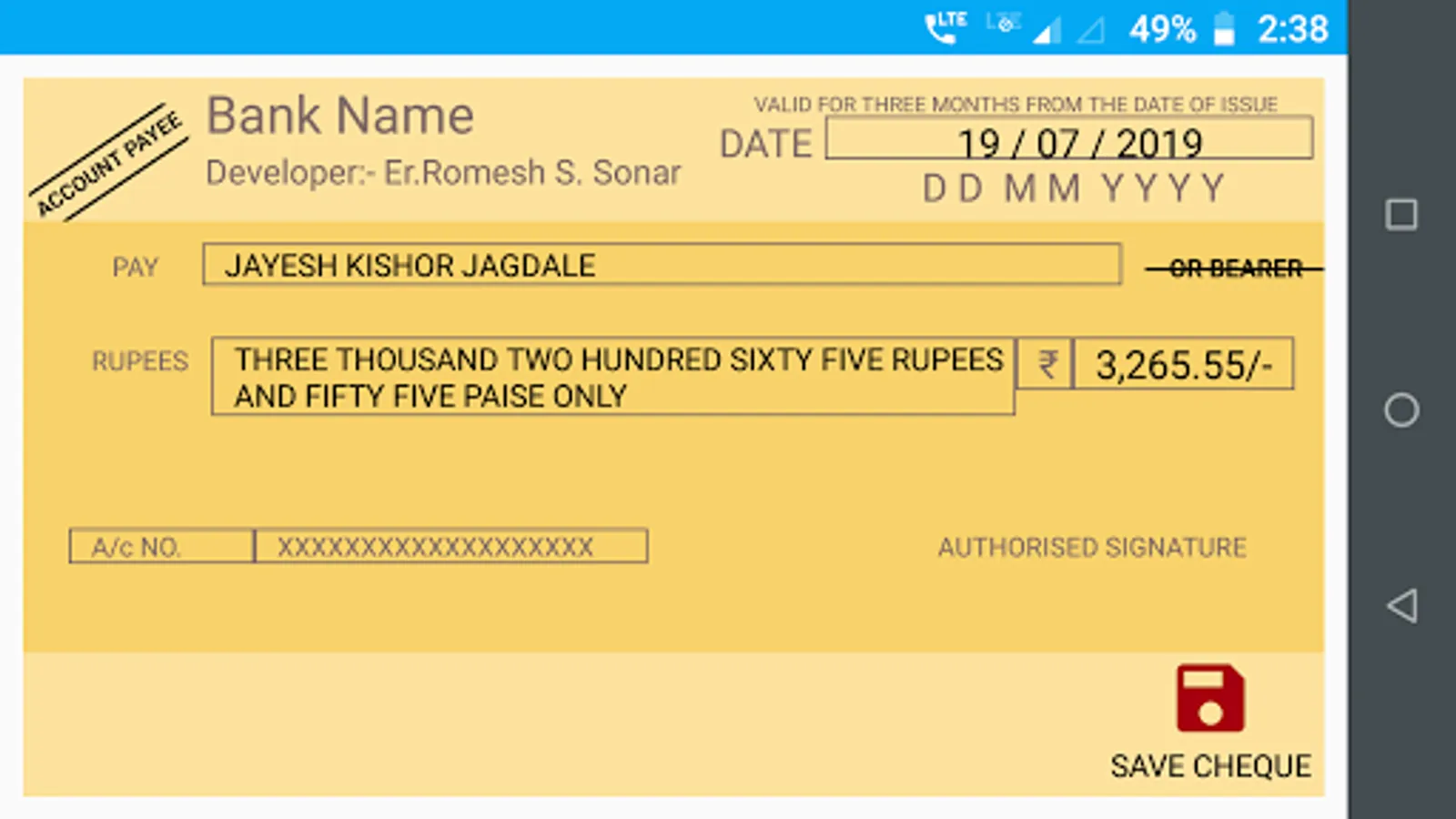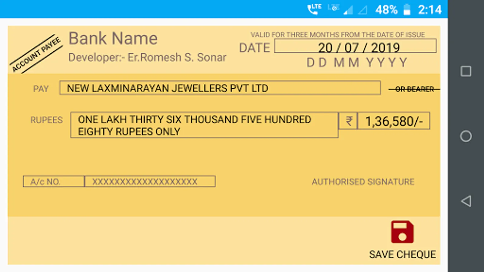 Cheque Writer converts INR number into texts for cheque writing purpose and you can save cheque to maintain cheque records slip.