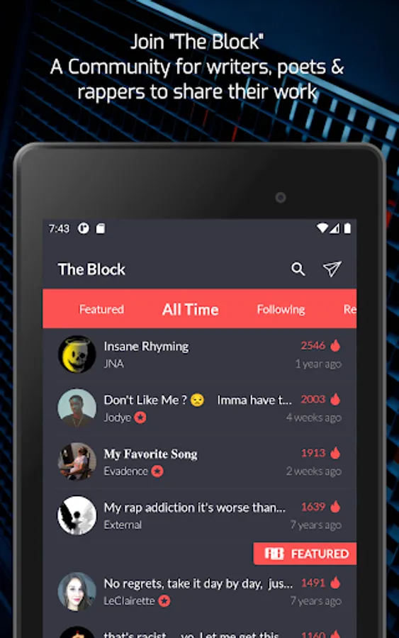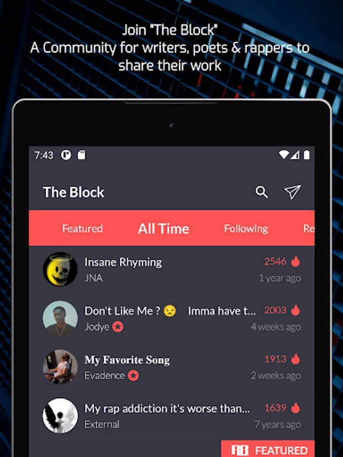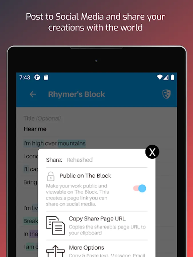 A Rhyming app with a social network? Yes! The best way to be inspired is by connecting with others. Share your work on The Block and get feedback. Explore the creativity of others. Give Respect and add comments. It's like a 24/7 Poetry Slam.