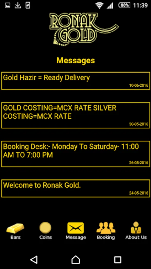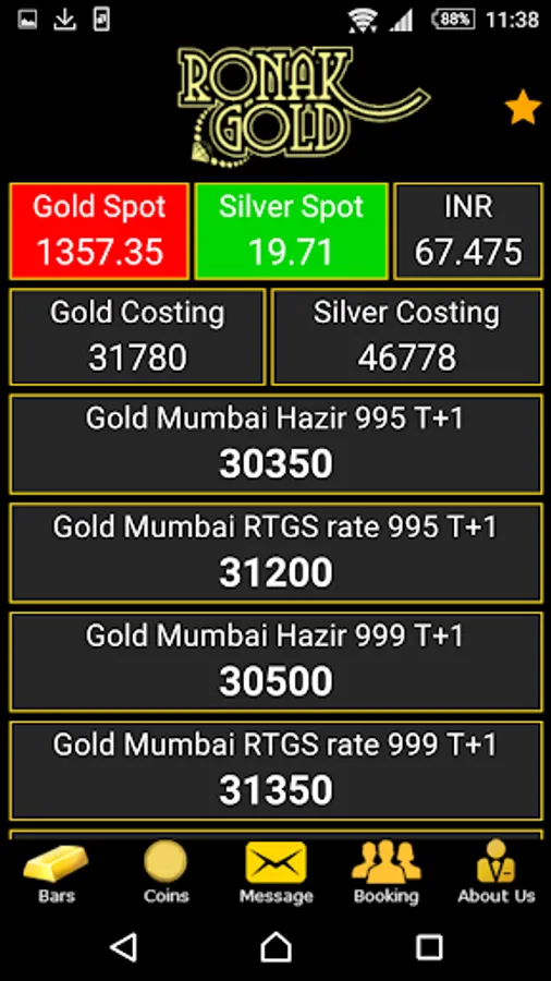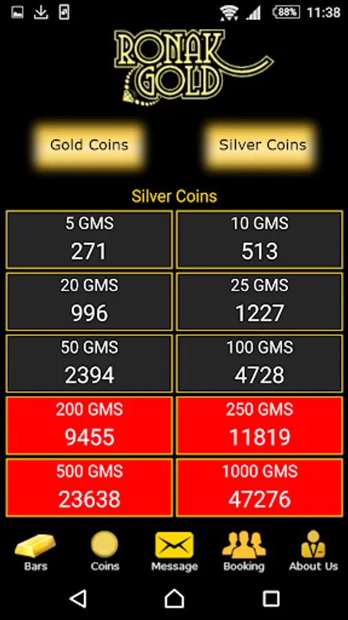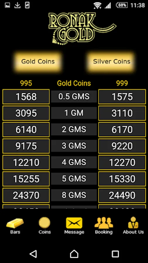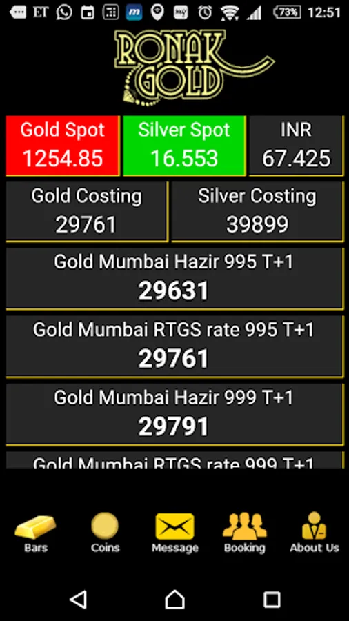 Ronak Gold is a mobile app which shows Live Rates of Gold Bars, Gold Coins and Silver Coins sold by Ronak Gold.