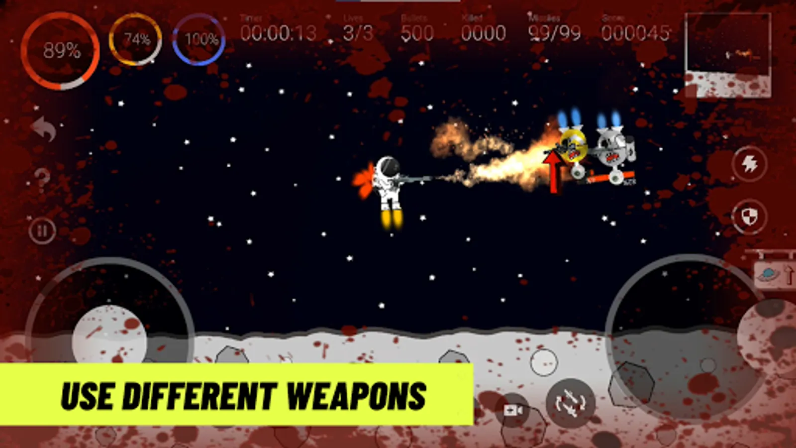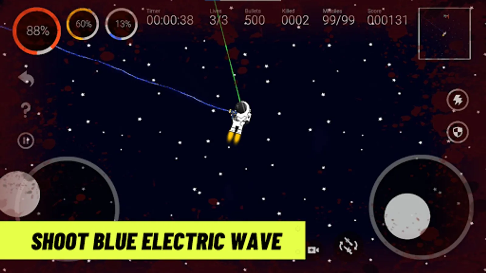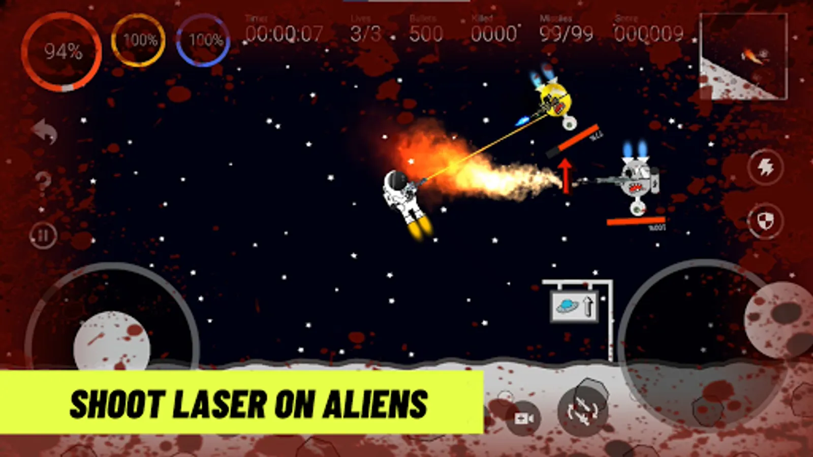 ✔ Don't forget to destroy all the UFOs and they could be died by the astronaut's laser, electric wave, machine gun, and flamethrower. Use it wisely.
