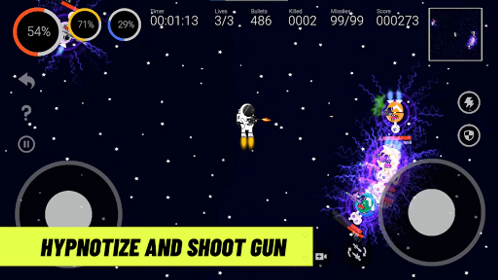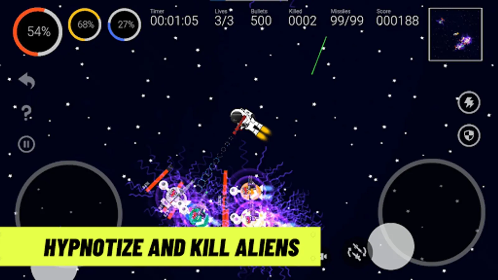 ✔ Hypnotize for few seconds using sound waves is also a great mechanic of this space game. So, use it anytime and the result of this that aliens cannot do anything like shooting, chasing, damage.