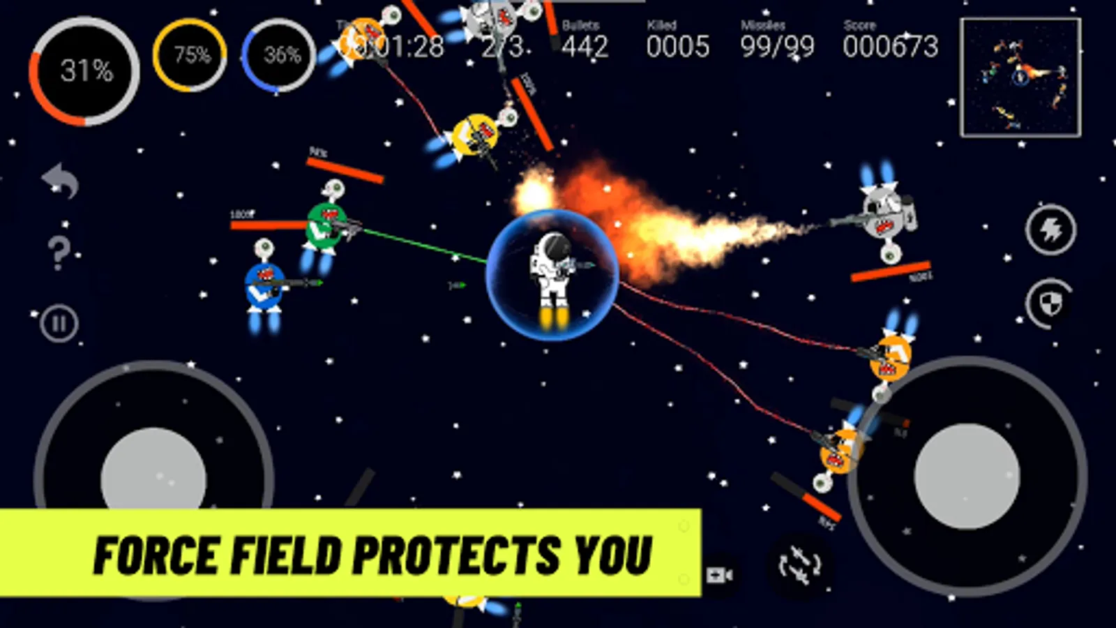 ✔ Enable a force field whenever an astronaut finds himself in a problem and it will protect him from the aliens for 15 seconds.