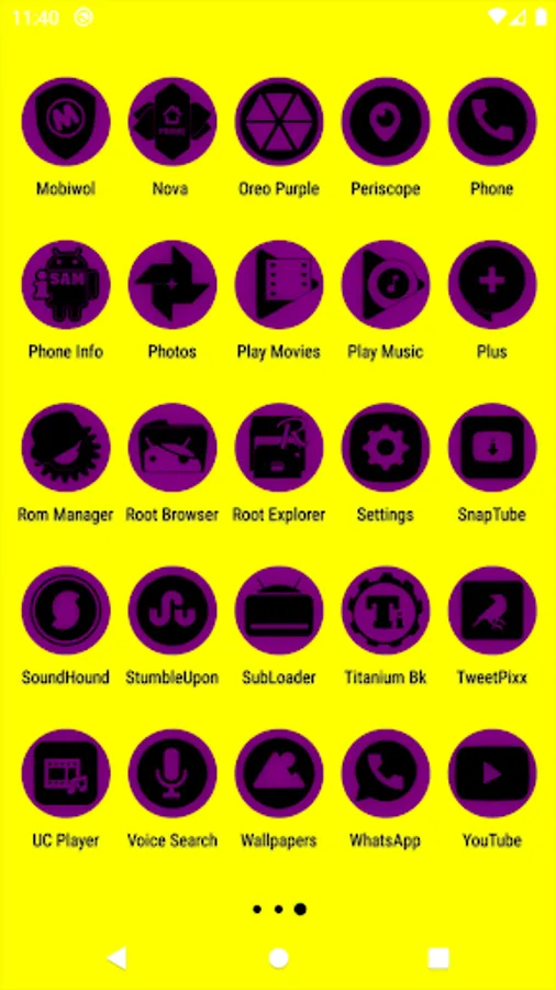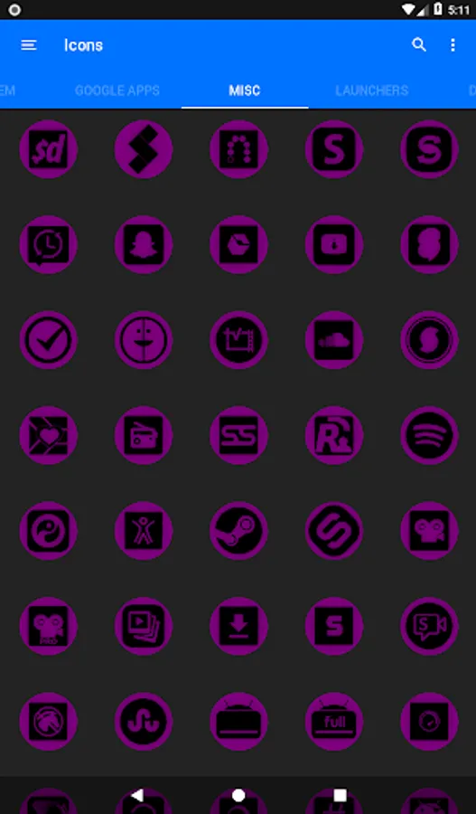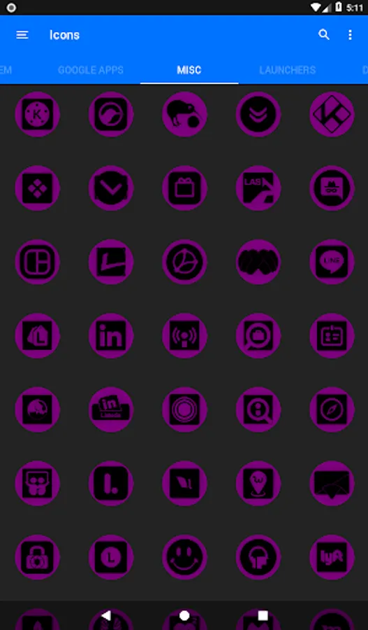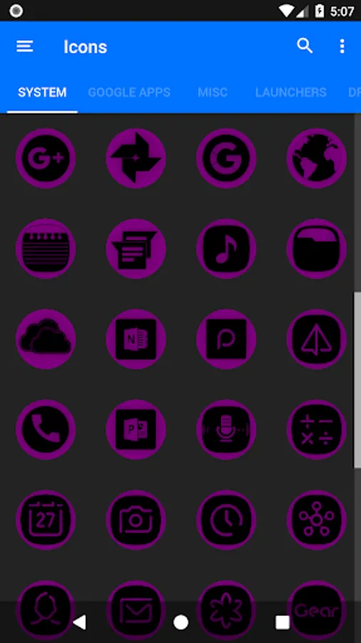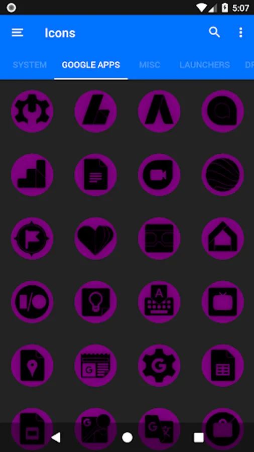 3.Select the icon, this will show your icon packs, select Oreo Purple and choose your favourite icon, Built-in Search Feature within the App.