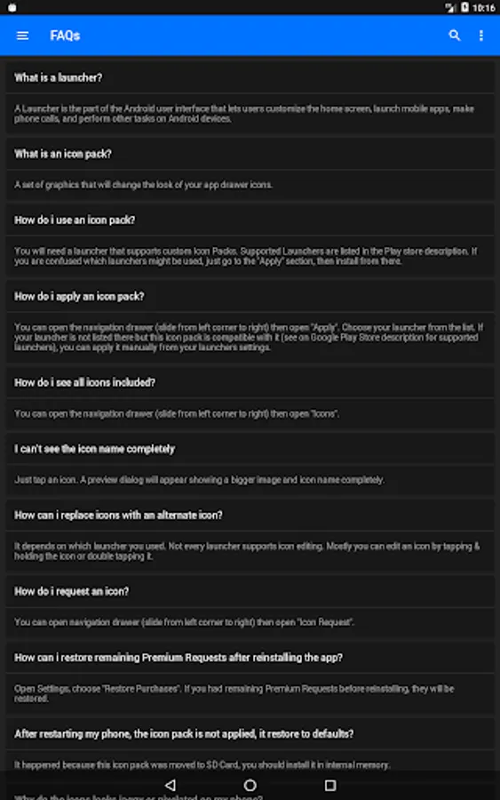 Icon Pack contains 5100+ HD Icons for mobile phones and tablets, tap on "See More" at the bottom of the page or search for "Ronald Dwk" for more icon packs, there are over 300 icon packs both free & paid to choose from in different colors, shapes and designs.