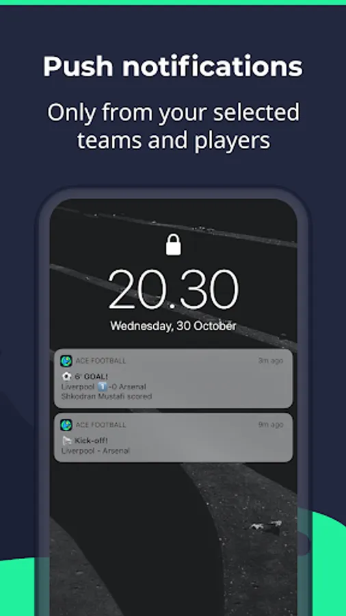You decide which messages you want. We've made it super easy to turn on and off. You can choose to receive push notifications when there's something new about your favourite team, e.g. previews, news, transfer rumours or goals during a match. Notifications should be relevant to you – so we let you control them 100%.