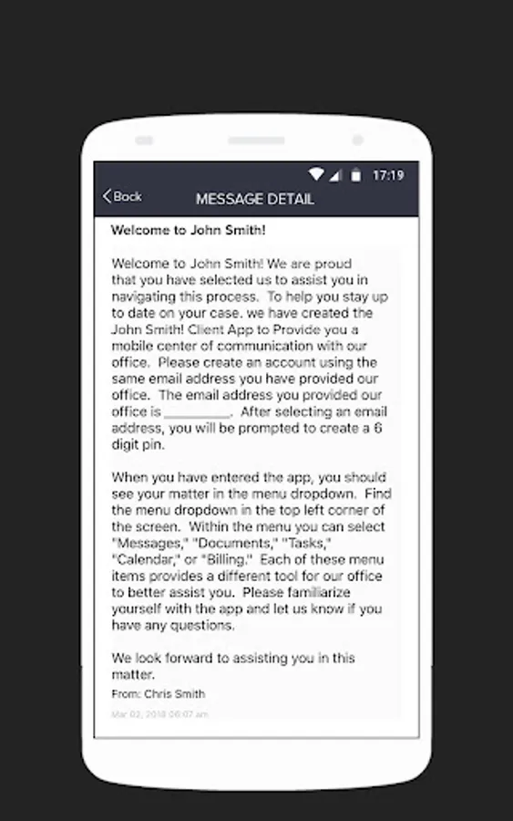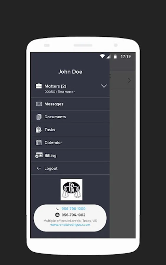 Ronald Rodriguez is for clients of the law firm Ronald Rodriguez. The App is intended to assist clients in communicating with their attorney and staying informed regarding their case. Clients may utilize a message feature to send and receive messages with their attorney, as well as upload and view documents, receive assigned tasks from their attorney, view their case calendar, and stay up to date on their bill. The Ronald Rodriguez is intended to supplement traditional means of communication and insure the clients of Ronald Rodriguez are thoroughly informed.