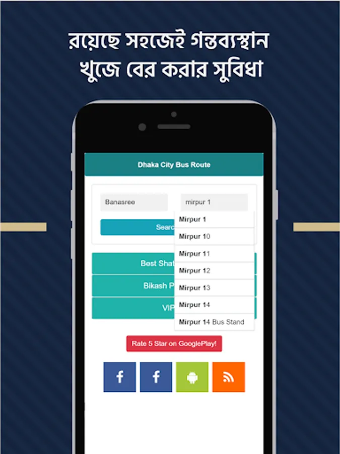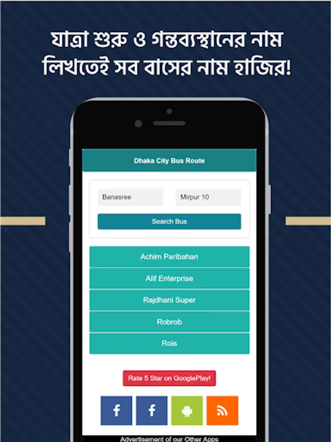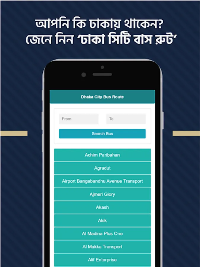 This is regularly needed android app. This bus route app contains all the name and route of bus services in Dhaka. You can find name of any local or sitting/counter bus of Dhaka using this bus service app. Many of us have map of Bangladesh. If you look at bd map, Dhaka is at the center of Bangladesh map. If you take a look at dhaka city map, dhaka city is a mega town. There are too many roads and ways, thousands of bus services including sitting service and local bus. But without a local bus timetable app you will fail to find the right bus. But this bangla android app can save you providing list of all the bus route. You can search for a particular bus or a specific place. In the near future we will add all bangladesh bus and intercity bus fare list. This will work similarly as bus ticket booking, train ticket and schedule in bd by railway apps.