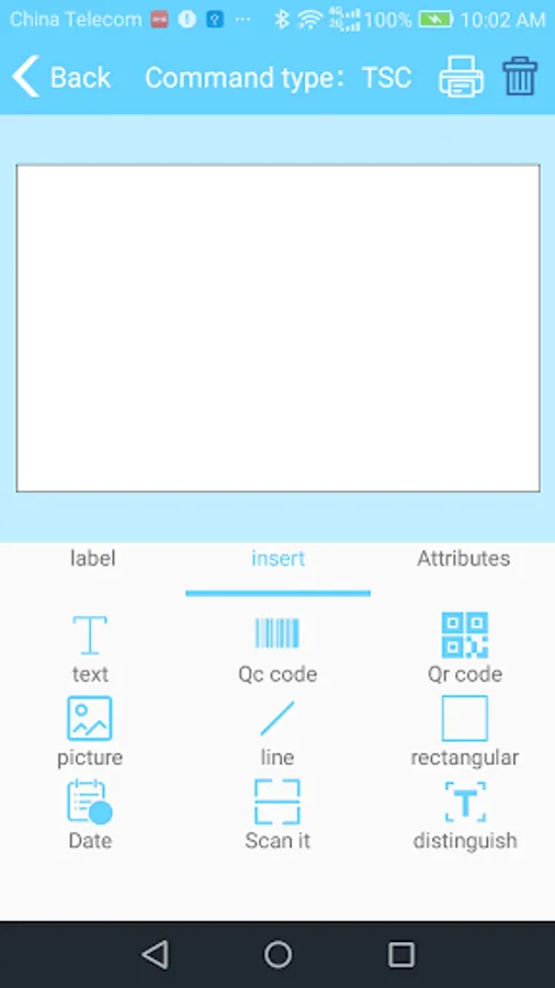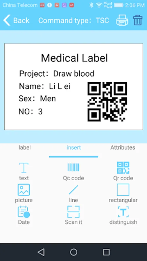 1. Label editing,Support printing bar codes, QRCode, text, lines, rectangles and pictures and other elements. can control the name, position, size, rotation direction, font size, word spacing and other attributes of each element in the label through the property panel