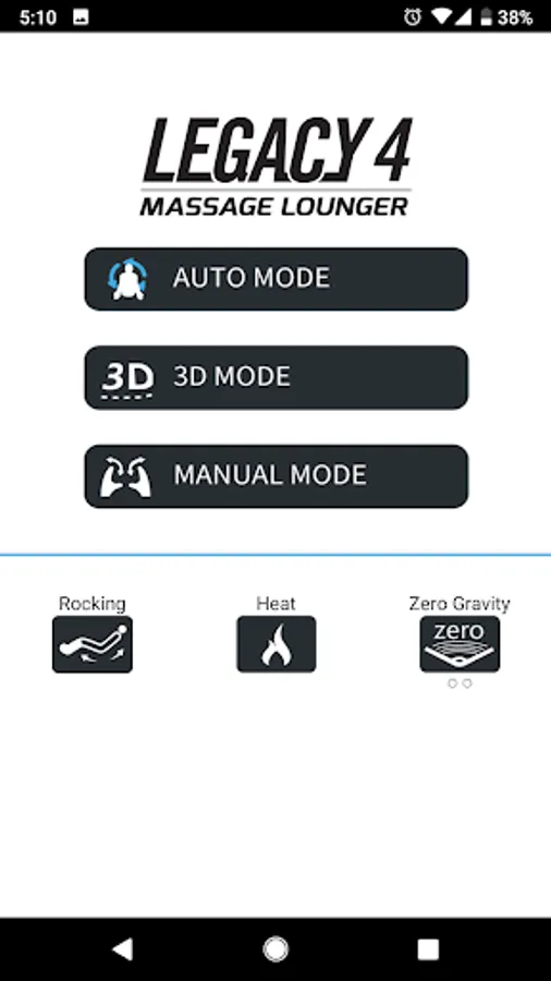 The Daiwa Legacy 4 App connects wirelessly to your Legacy 4 massage chair using Bluetooth. Use the app to access the controls, including activating manual and automatic massage programs.