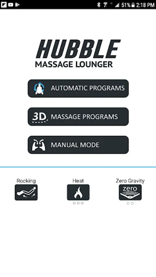 The Daiwa Hubble Massage Chair App connects wirelessly to your Hubble massage chair using Bluetooth. Use the app to access the controls, including activating manual and automatic massage programs, saving custom user programs, targeting massage to different parts of your body, or varying the massage type and intensity.