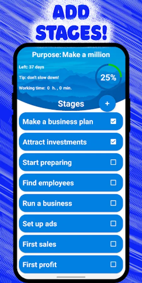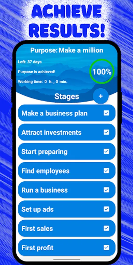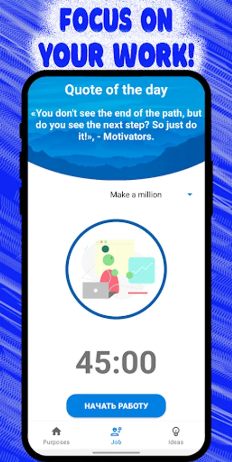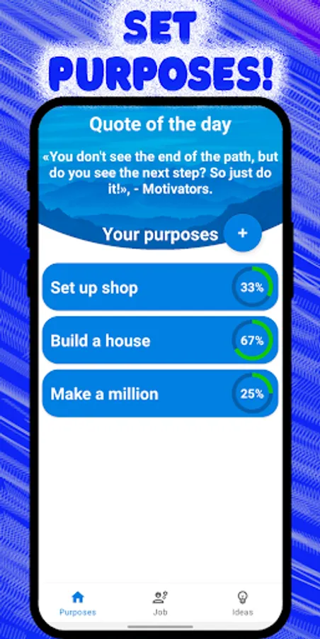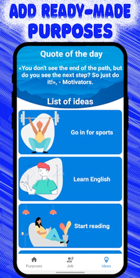 Select a ready-made purpose in the Ideas section. Add a purpose to yourself. And, having received motivation, go to success.!