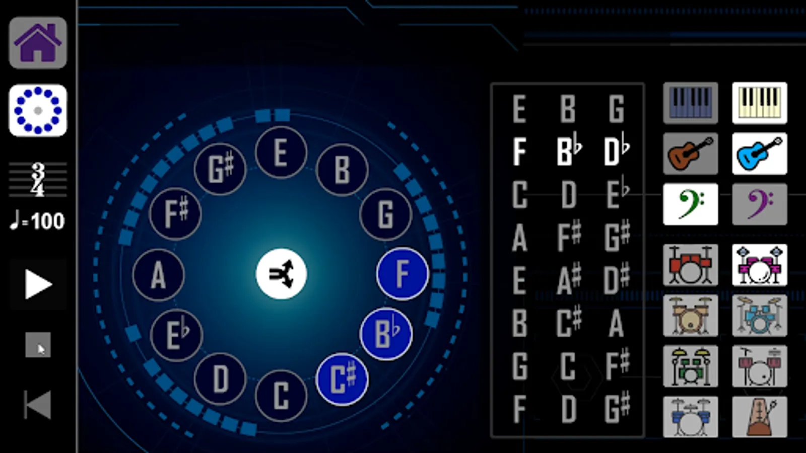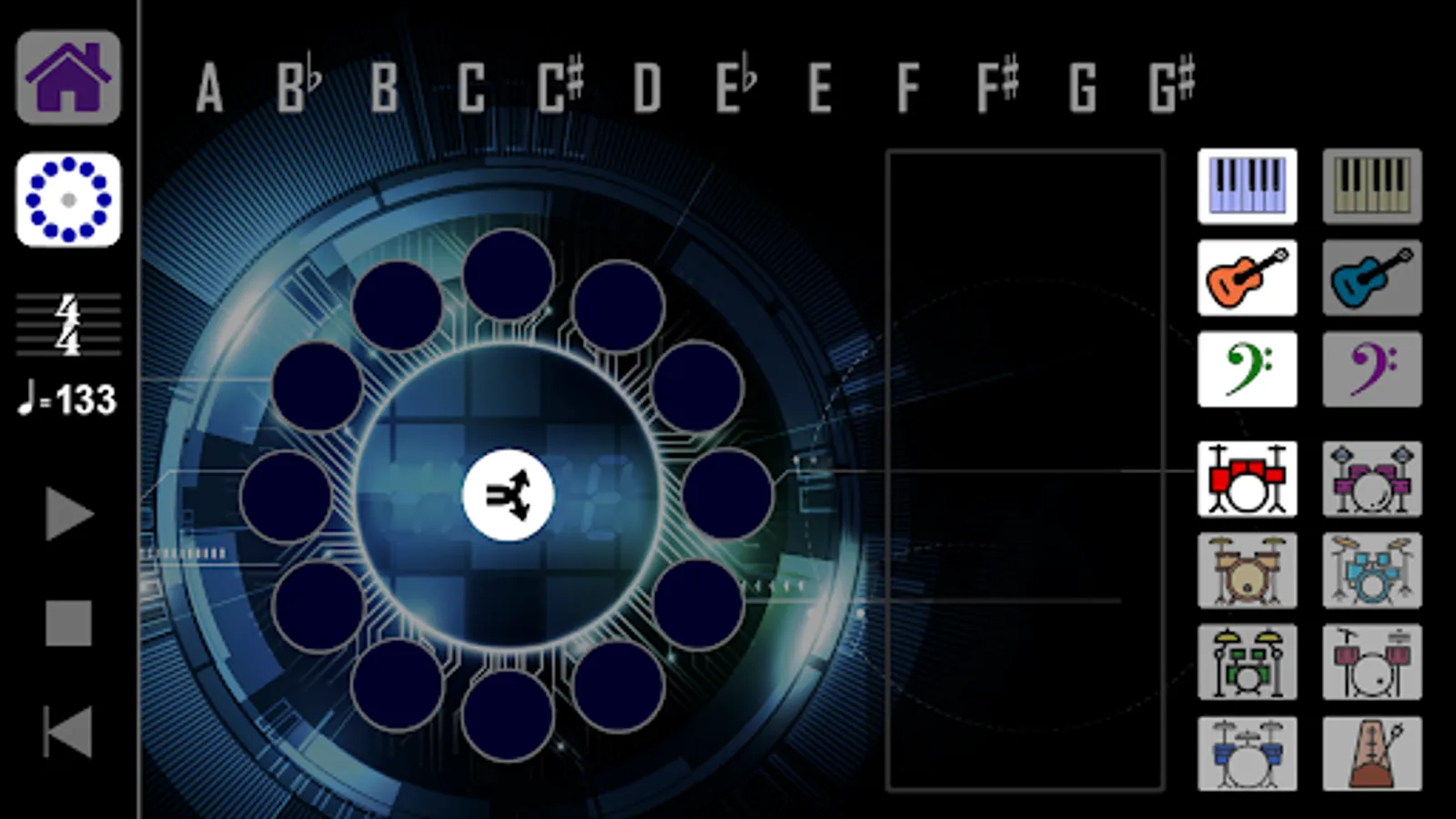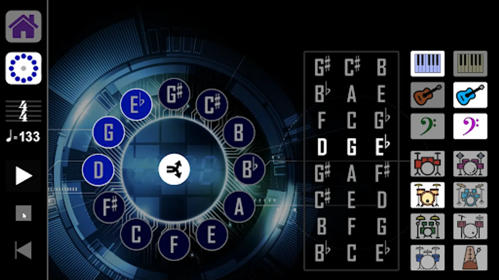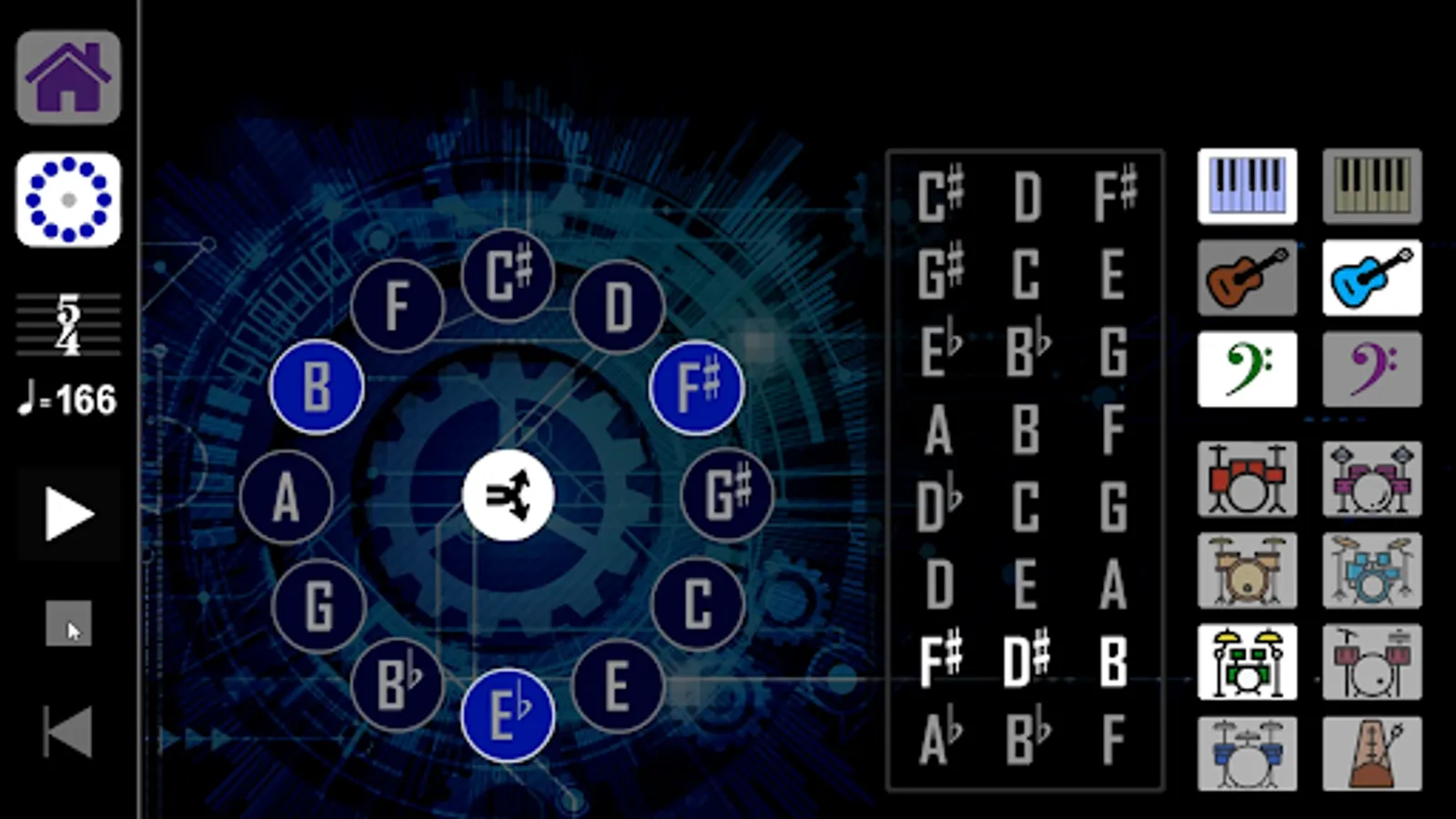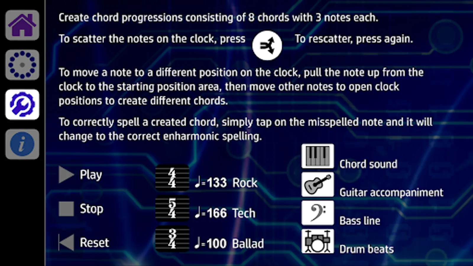 The app creates progressions consisting of 8 note groups made up of 3 notes each using all 12 musical notes. Select measures of 4/4 at 133bpm, 3/4 at 100 bpm, or 5/4 at 166bpm. Each time signature/tempo has 7 different drum beats to choose from, and a click track.
