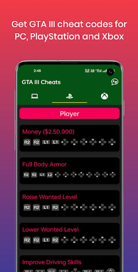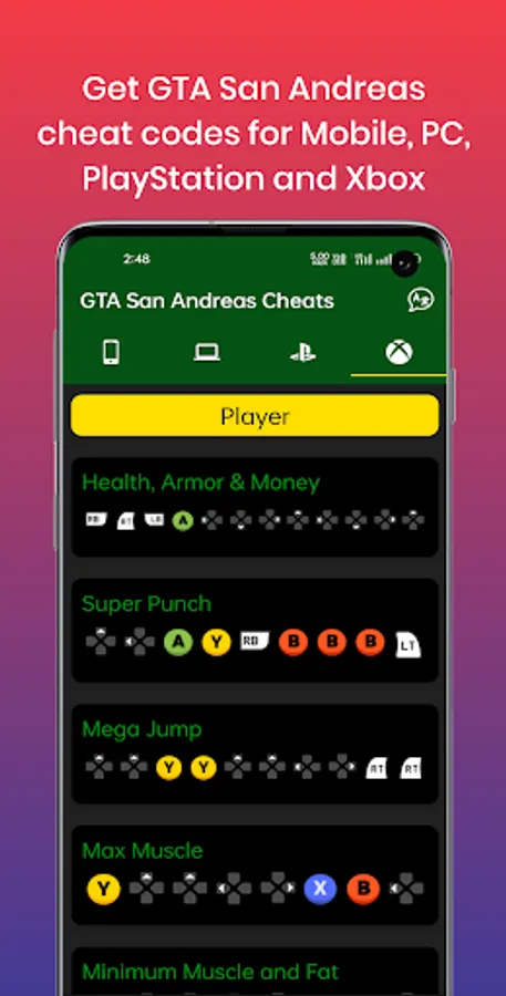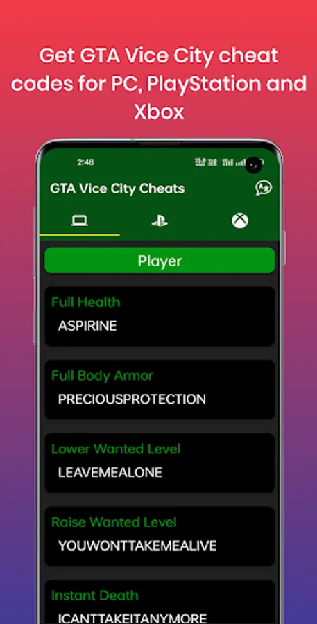 Here the V cheats are provided in 5 categories.