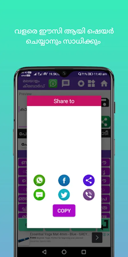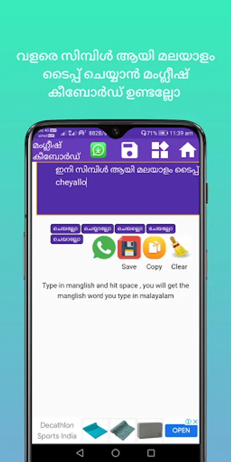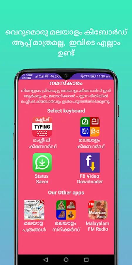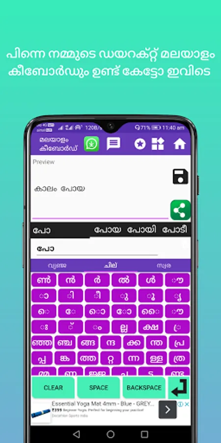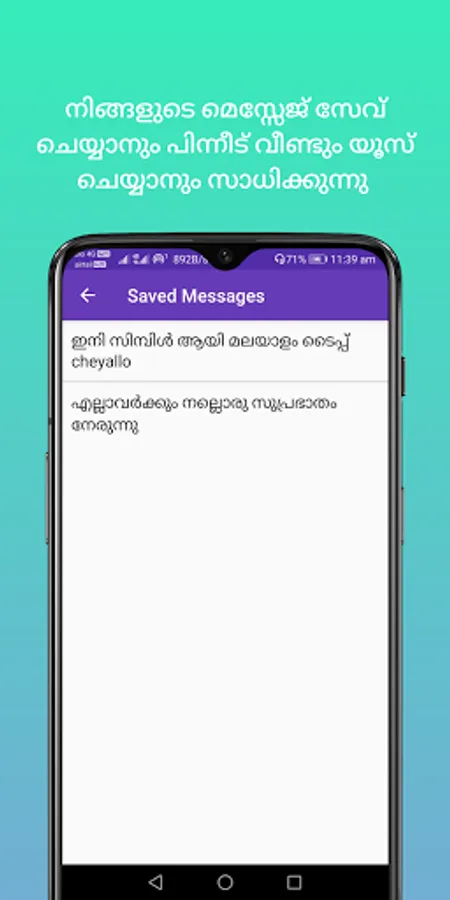 Our Malayalam keyboard app is different from other apps, you can write your message and save your message in our app itself and anytime. You can send the message to anyone using our special share message button to various messaging and social media application.