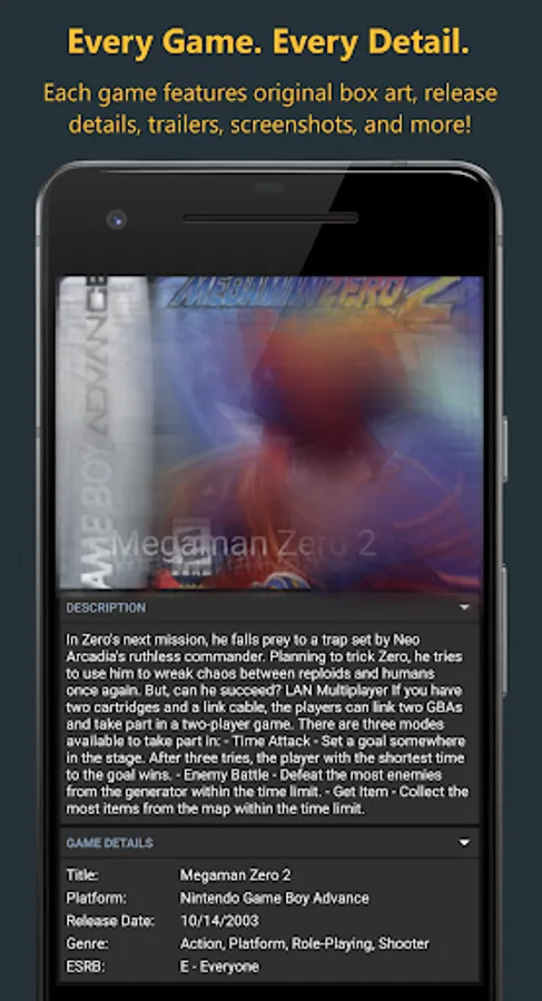 Each listing includes complete details about the game: Title, Description, Genre, Box Art, Screenshots, Trailer / Gameplay Videos, Release Date, Publisher, Developer, Number of Players, Player Rating, and more. Links are available to help you find a ROM, look up tips and walkthroughs, buy the game, etc.