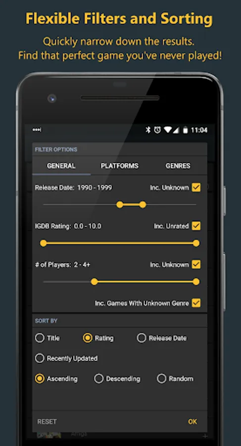Bored? Looking for a new game? Use the apps filters and sorting system to easily find games that match your play style! Find all RPGs for the SNES and sort them by rating. Or browse through all shooters released for the PC in 2017. Or find the best two-player games for the Xbox One. Or list all retro games from the 1980's! The possibilities are endless!