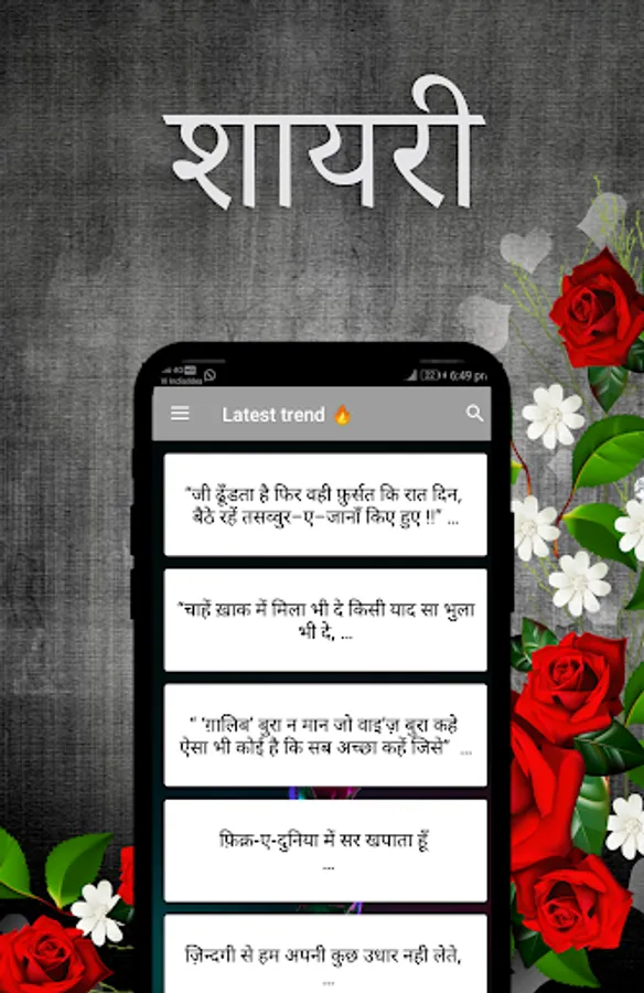 विभिन्न विषयों, विषयों, और प्रेम शायरी, उदास शायरी, प्रेरक शायरी, रोमांटिक शायरी, दोस्ती शायरी, इश्क शायरी, दर्द शायरी, बेवफ़ा शायरी, मोहब्बत शायरी, आदि जैसे मूड पर शेर की एक विशेष रूप से क्यूरेट सूची आसानी से पढ़ने के लिए उपलब्ध है और अपने दोस्तों के साथ साझा करना।