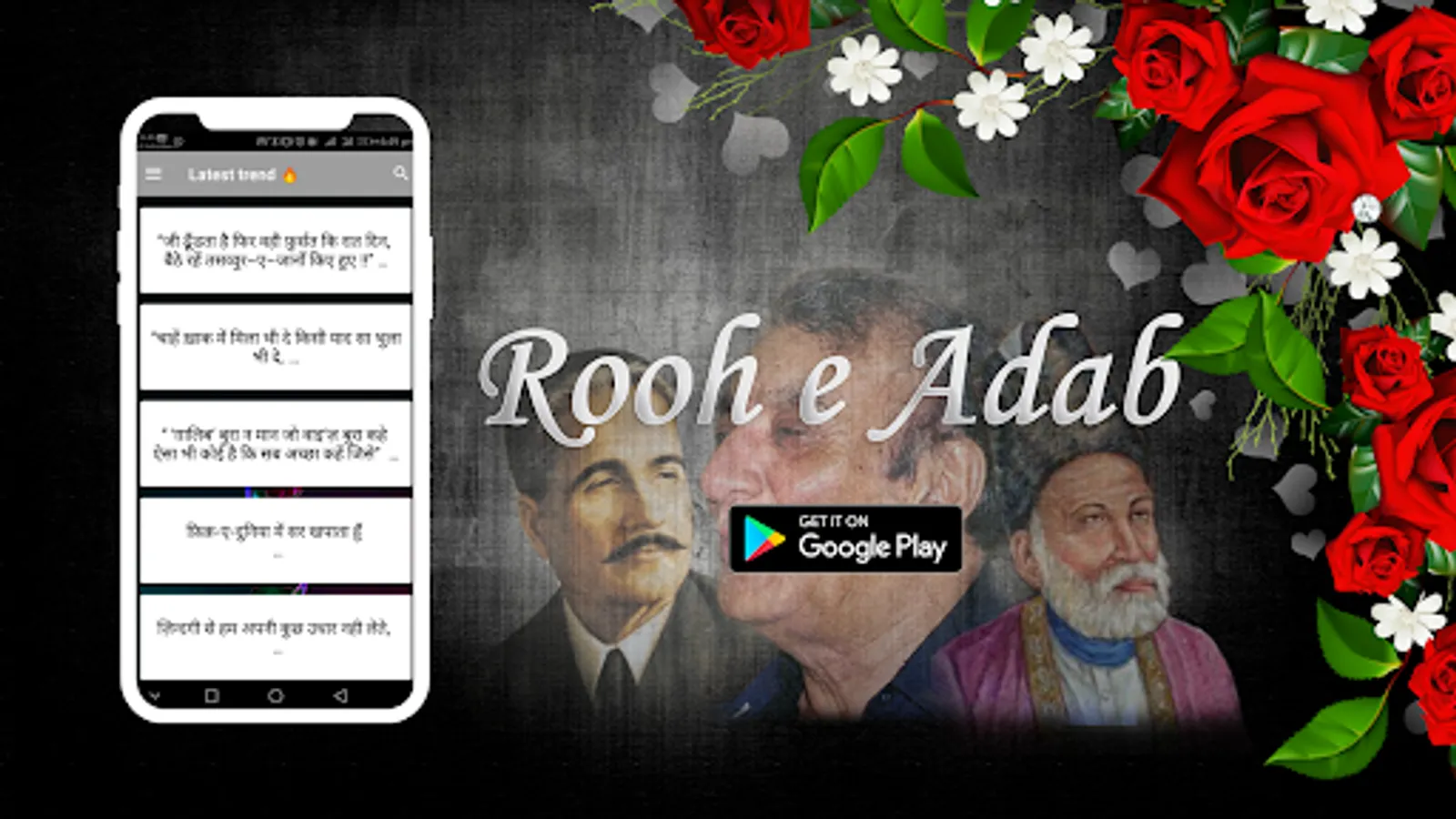 रूह ए अदब में मिर्ज़ा ग़ालिब, मीर तकी मीर, अल्लामा इकबाल, फ़ैज़ अहमद फ़ैज़, जौन एलिया, गुलज़ार, जावेद अख्तर, राहत इंदौरी, और अन्य प्रमुख कवियों जैसे प्रसिद्ध उर्दू कवियों की ग़ज़लों और नज़्मों का सबसे अच्छा संग्रह है। आप प्रगतिशील कवियों, महिला कवियों और नवोदित युवा कवियों की शायरी भी पढ़ सकते हैं।