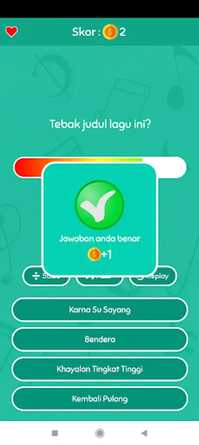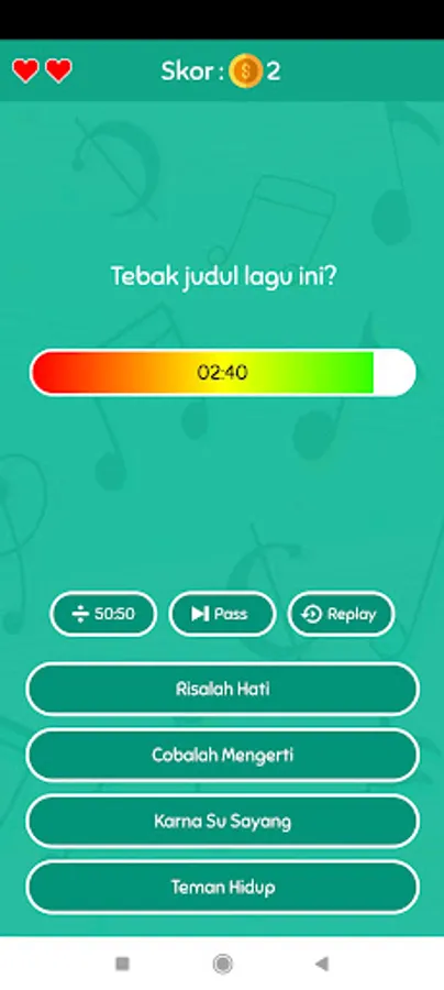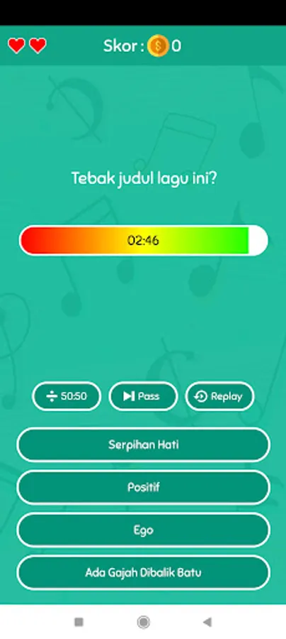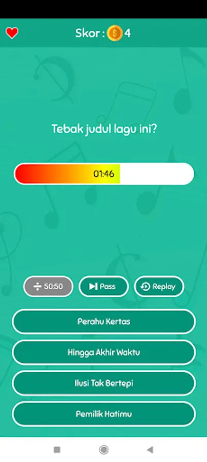You will be played an Indonesian song fragment. as long as the song is playing, you must immediately select the song title from the song that is playing. There are four choices, one of which is the right choice. When your guess is right, then you will automatically play the next song and guess the correct song title again. Every guess is correct, you will get 5 points. The time you need to guess the correct song title is 3 minutes. During play, there are 3 help you can use. that is