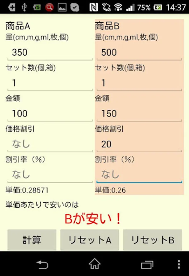 単価が表示され商品Aと商品Bどちらが単価が安いかが表示されます。